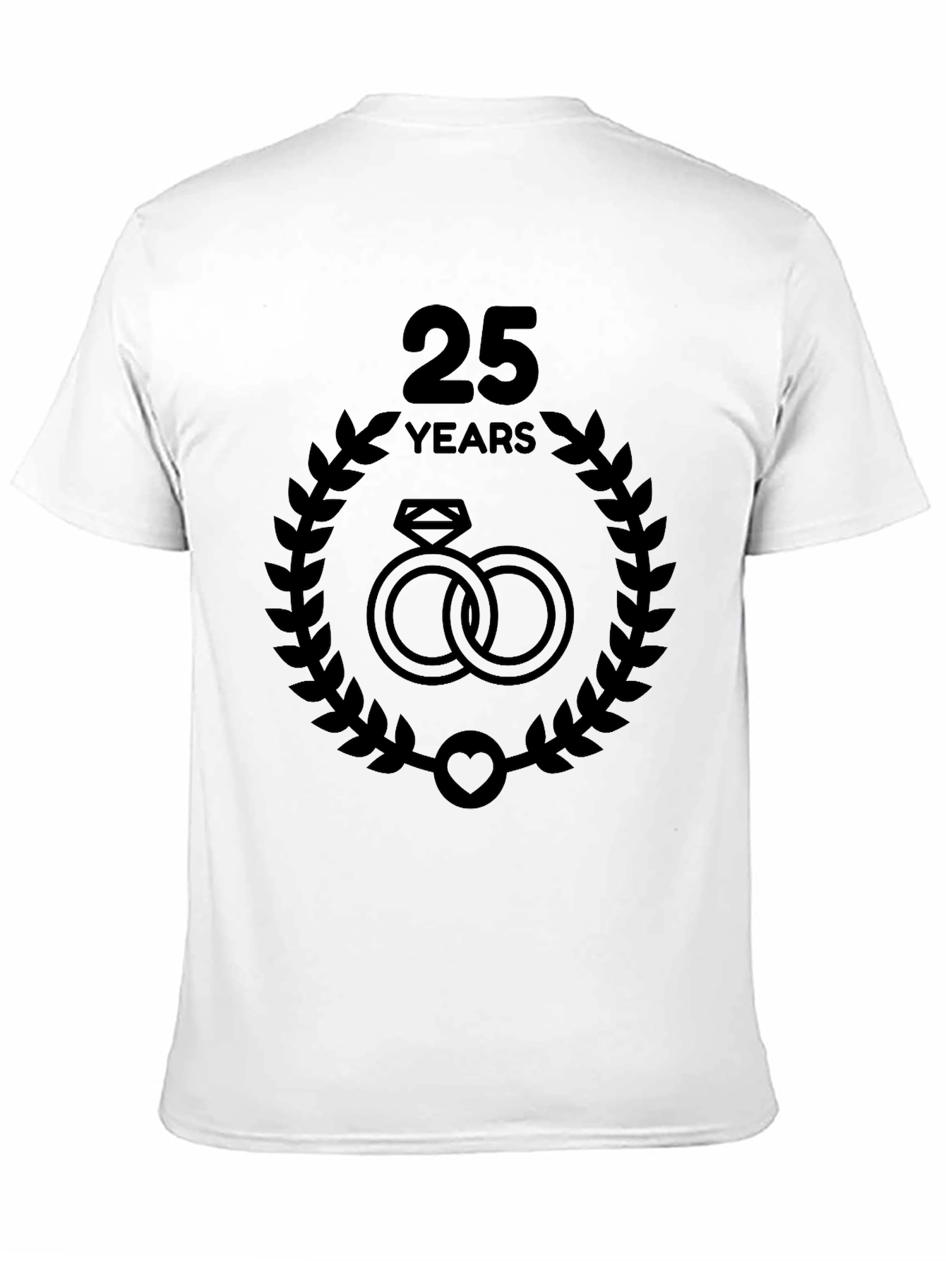 Celebrate a special milestone with this classic black tee featuring a "25 Years" graphic. The design showcases intertwined wedding rings encircled by a laurel wreath, symbolizing enduring love and commitment. A small heart accents the bottom of the wreath, adding a touch of romance. Perfect for commemorating a 25th wedding anniversary or as a thoughtful gift for a couple celebrating this momentous occasion. The understated yet elegant design makes it versatile for casual outings or relaxed gatherings. Show your love and celebrate a quarter-century of togetherness with this stylish and meaningful t-shirt.