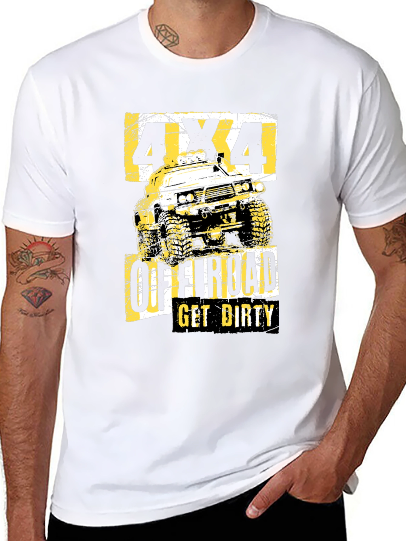Showcase your adventurous side with this bold black graphic T-shirt. Featuring a vibrant "4x4 Off-Road Get Dirty" design, this shirt is perfect for off-road enthusiasts and anyone who loves the outdoors. The print includes a vehicle illustration. Made from comfortable material, this short-sleeve T-shirt offers a relaxed fit and is ideal for casual wear. Whether you're hitting the trails or just hanging out, this T-shirt will make a statement. Gear up and get ready to get dirty!