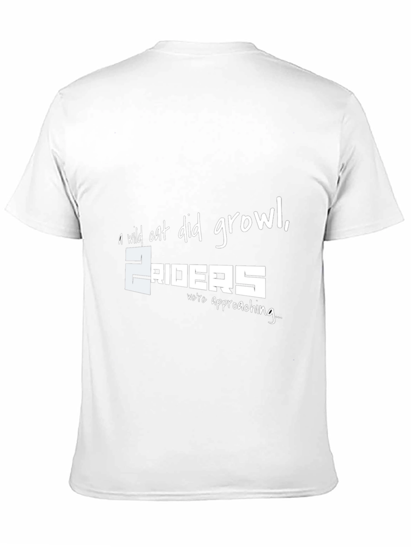 Show off your unique style with this eye-catching black t-shirt featuring the phrase, 'A Wild Cat Did Growl, 2 Riders, We're Approaching'. The design is printed in white across the chest, ensuring high visibility. The shirt appears to be made from a comfortable, breathable fabric, perfect for everyday wear. This stylish tee is ideal for casual outings, concerts, or simply relaxing at home. Its bold graphic makes it a great conversation starter and a must-have for anyone who loves unique apparel. Get yours today!