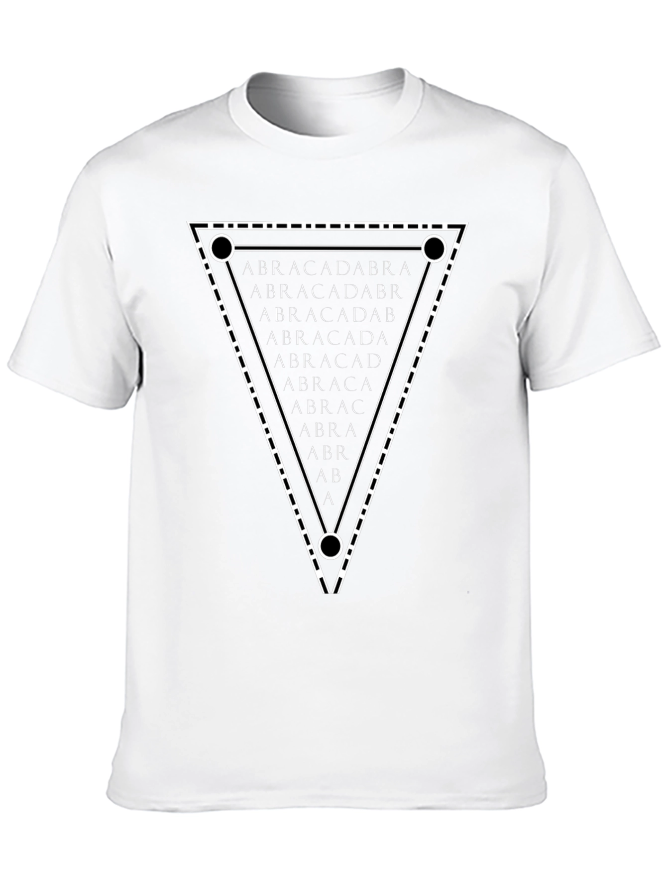 Embrace enigmatic style with this eye-catching graphic tee. The black shirt features a striking white triangular design filled with the word 'ABRACADABRA' progressively shortened, creating a captivating visual effect. The geometric pattern adds a modern occult touch, perfect for those who appreciate unique and thought-provoking fashion. Made from comfortable materials, this shirt offers a relaxed fit suitable for everyday wear. Stand out from the crowd and showcase your individuality with this conversation-starting tee. Ideal for casual outings, concerts, or expressing your personal style.