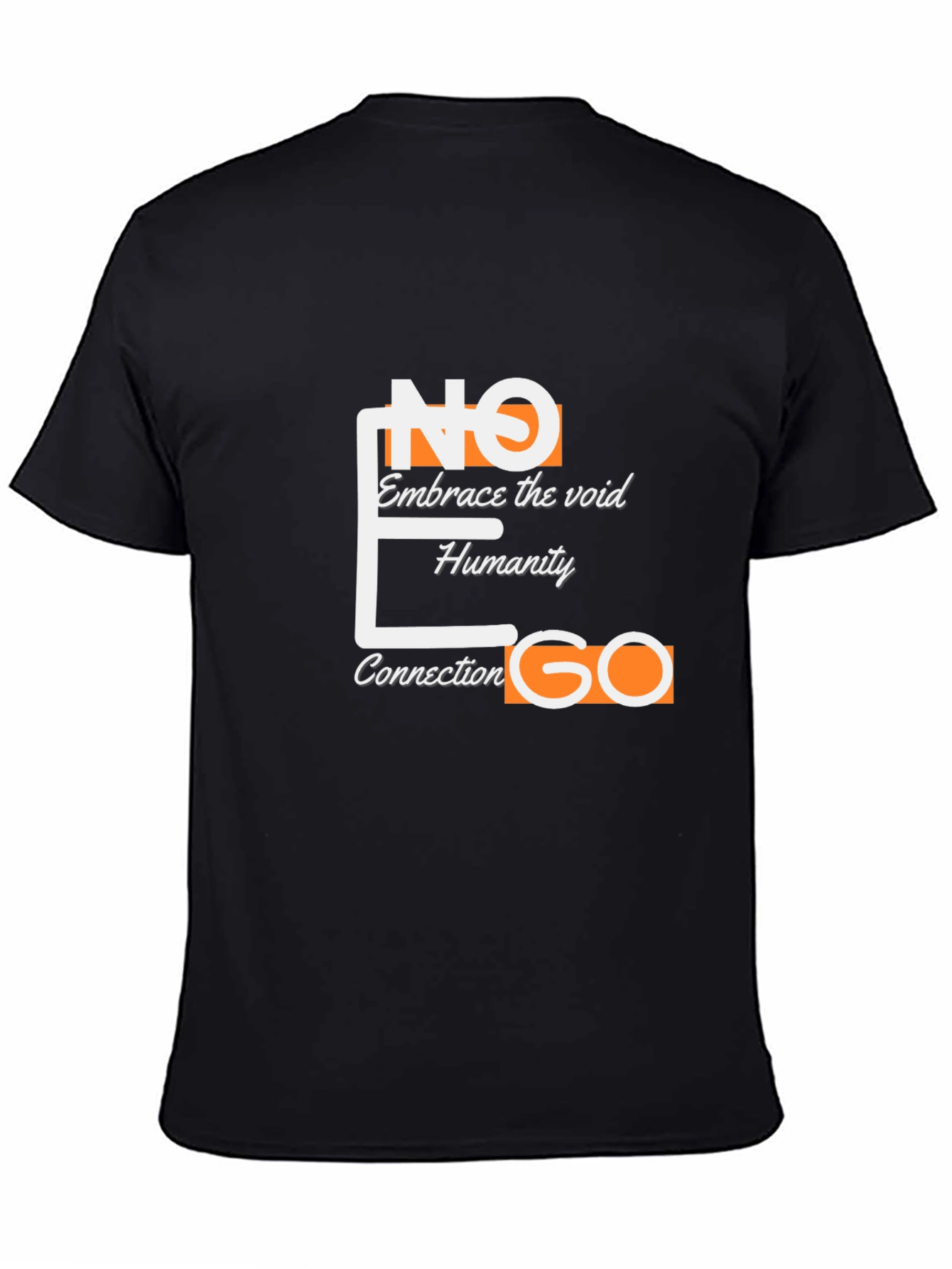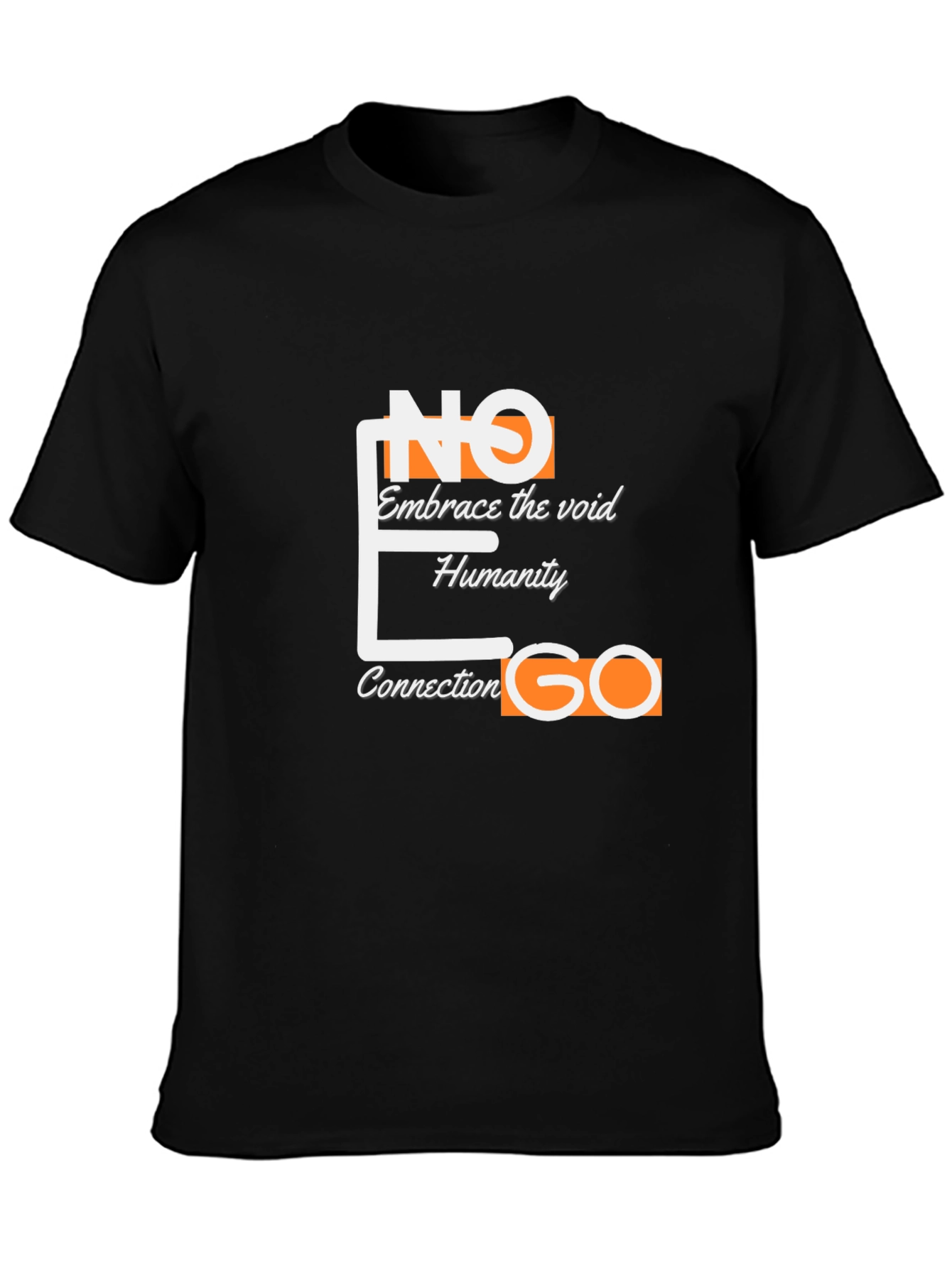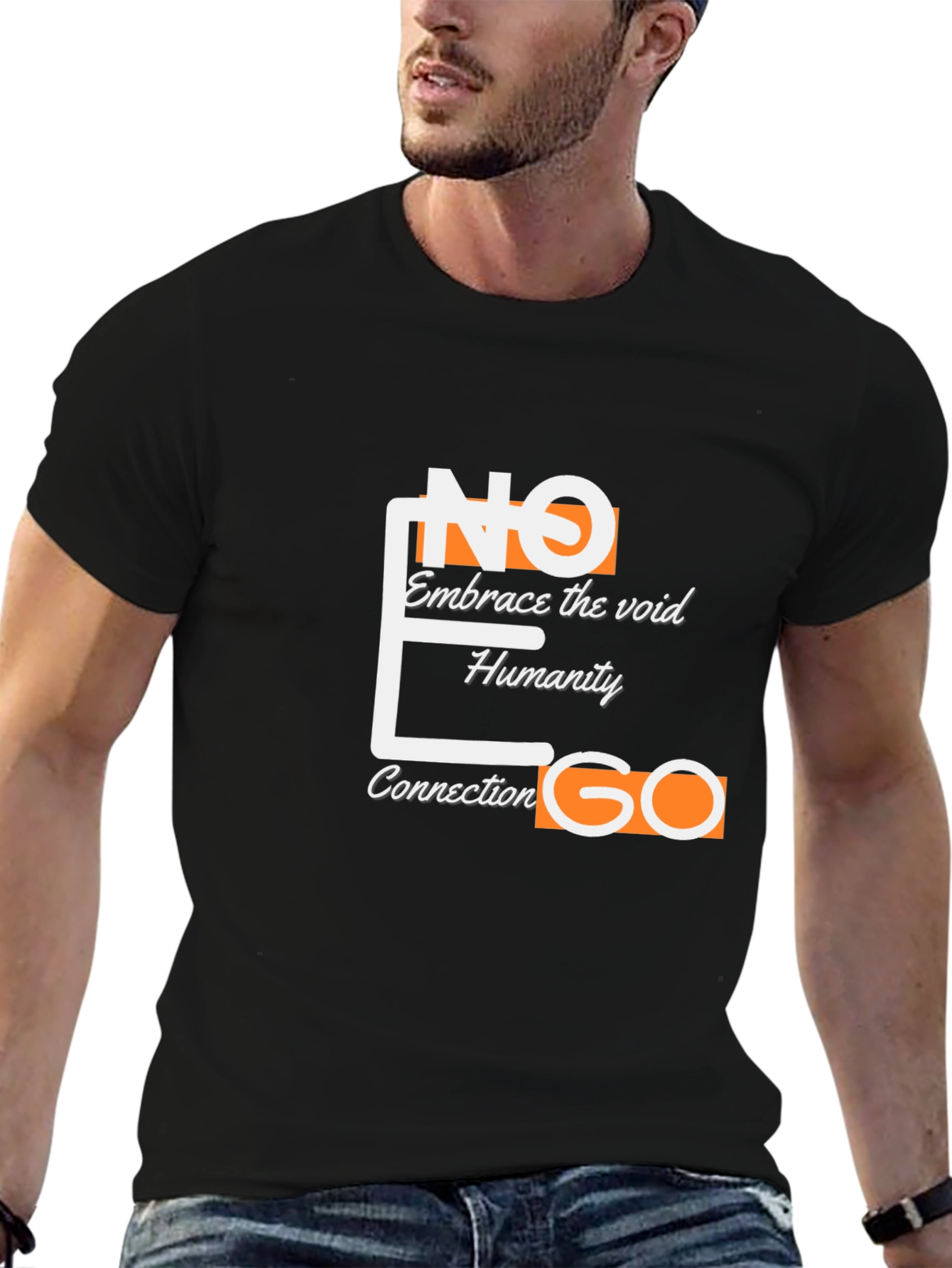 Elevate your wardrobe with this striking black graphic tee. This t-shirt features a bold, abstract design with the words "NO EGO" integrated into a modern, minimalist graphic. The design also contains the words "Embrace the void, Humanity, Connection". The crisp white contrasts beautifully against the solid black background, ensuring the design pops. Made from soft, breathable fabric, this tee offers exceptional comfort and durability. Perfect for casual outings, social events, or expressing your unique style, this graphic tee is a must-have addition to any fashion-forward individual's collection.