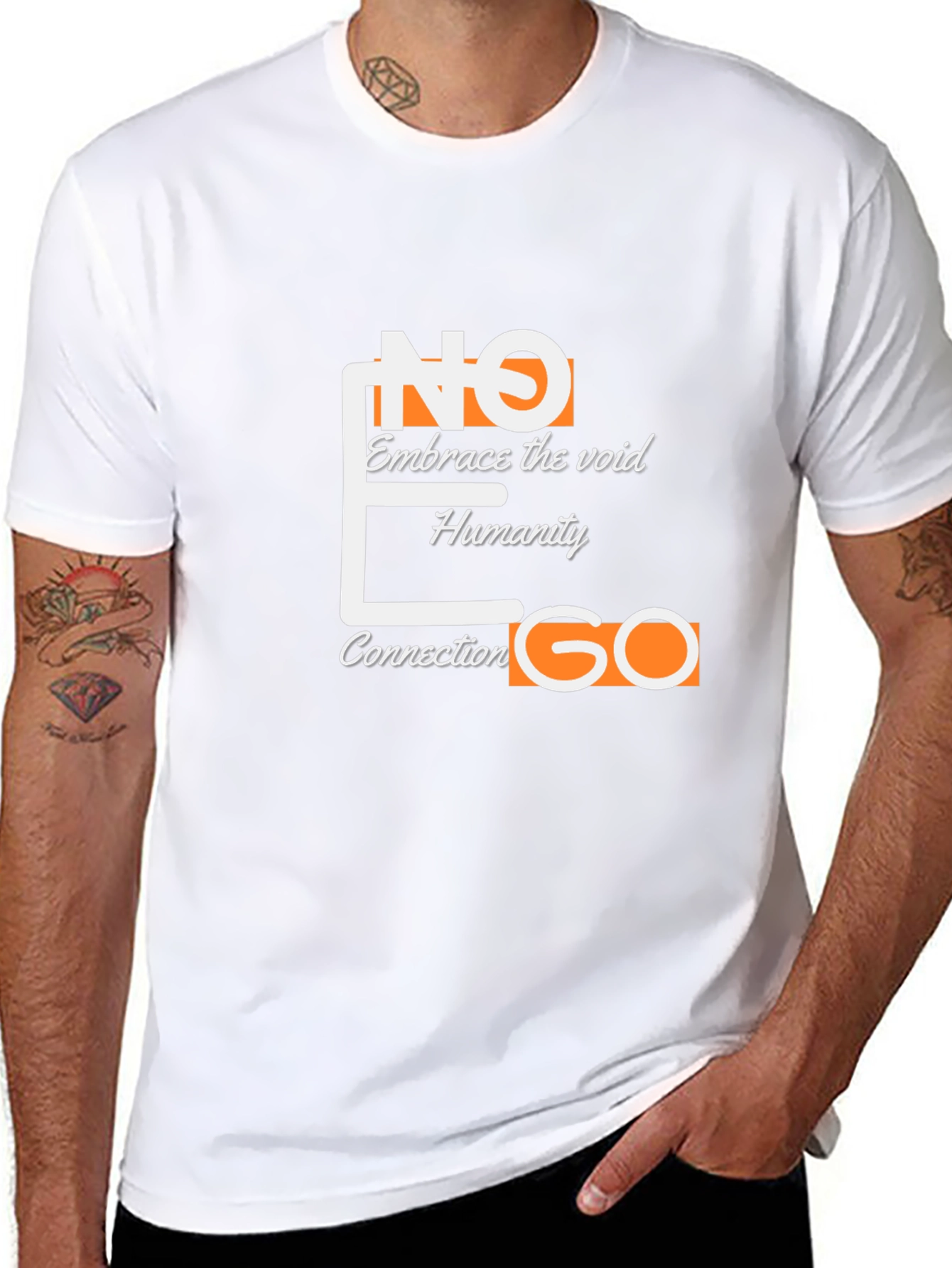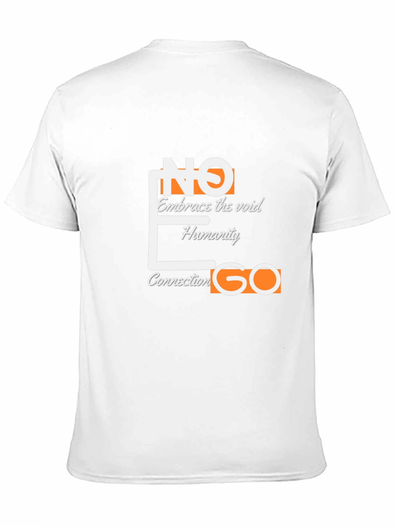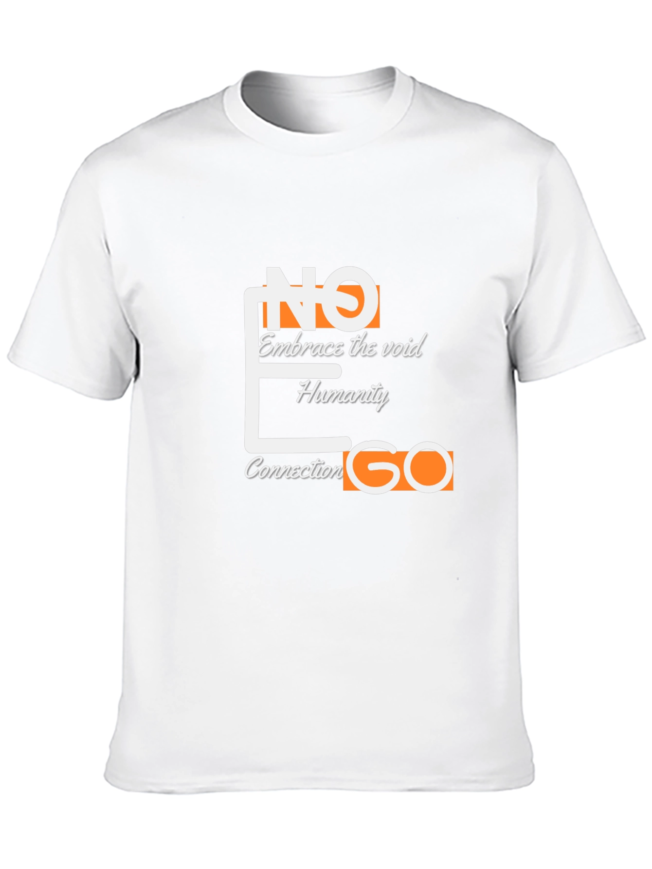 Elevate your wardrobe with this striking black graphic tee. This t-shirt features a bold, abstract design with the words "NO EGO" integrated into a modern, minimalist graphic. The design also contains the words "Embrace the void, Humanity, Connection". The crisp white contrasts beautifully against the solid black background, ensuring the design pops. Made from soft, breathable fabric, this tee offers exceptional comfort and durability. Perfect for casual outings, social events, or expressing your unique style, this graphic tee is a must-have addition to any fashion-forward individual's collection.