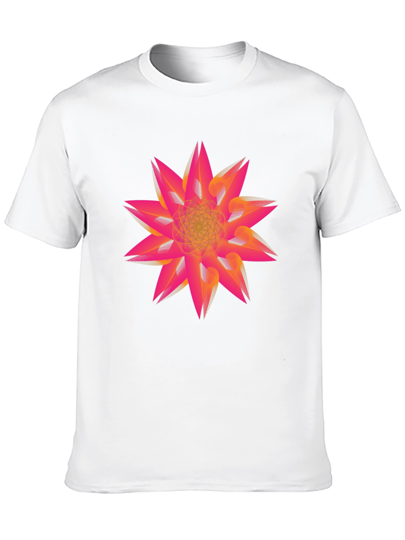 Elevate your style with this striking black t-shirt featuring a bold, abstract geometric flower design. The vibrant pink and orange hues create a captivating visual effect, making it a standout piece in any wardrobe. Made from a soft, breathable fabric, this tee offers exceptional comfort for everyday wear. The unique graphic adds a modern, artistic touch, perfect for casual outings, concerts, or expressing your individuality. Pair it with jeans or shorts for a stylish, effortless look. A must-have for those who appreciate contemporary design and comfort.