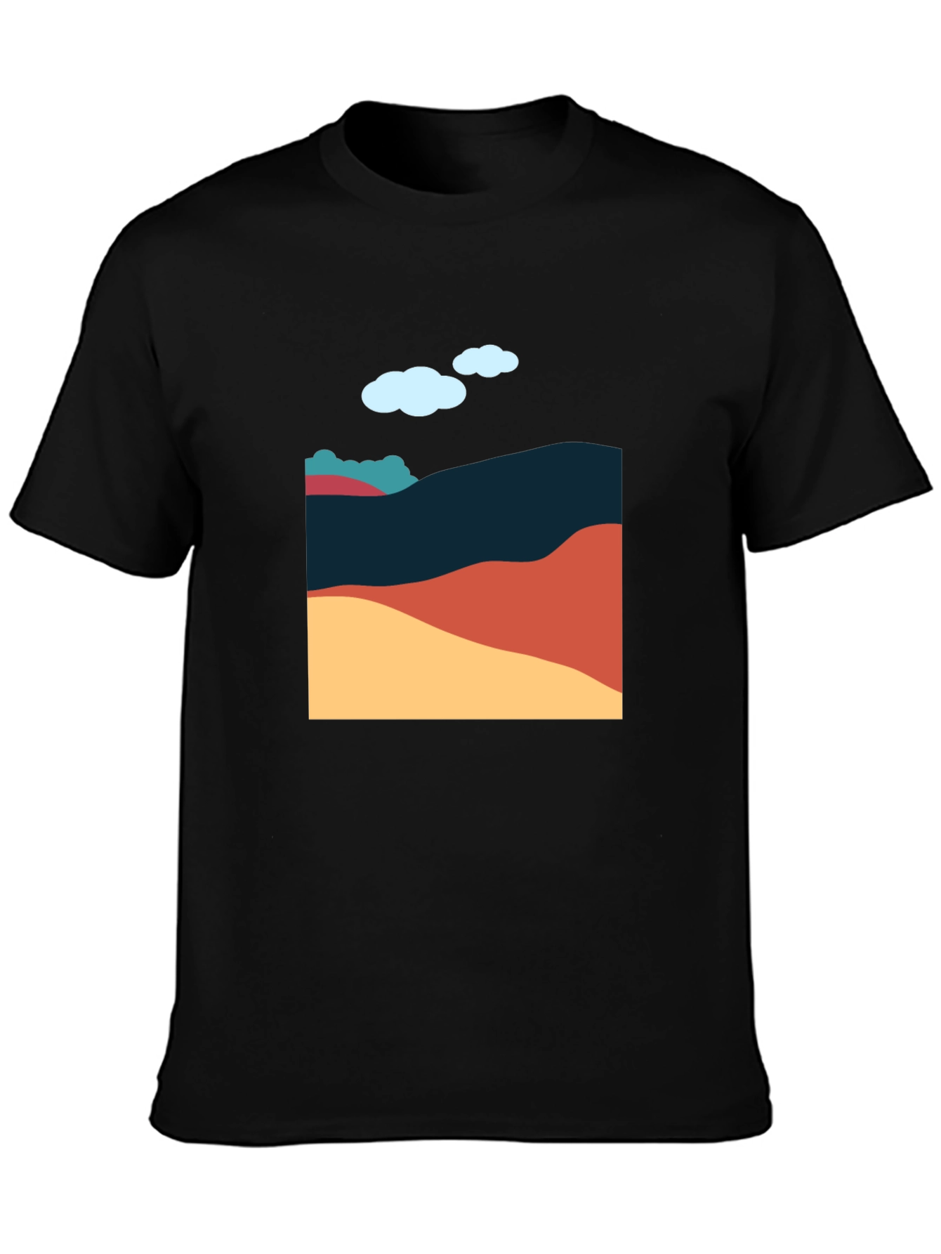 Show off your artistic side with this unique graphic tee. Featuring a contemporary abstract landscape design, this black t-shirt is made from a comfortable fabric that is soft to the touch. The minimalist art style features layered earth tones and a simple cloud design, creating a stylish and eye-catching look. Perfect for casual wear, this t-shirt can be paired with jeans, shorts, or chinos for a versatile everyday outfit. Add a touch of modern art to your wardrobe with this must-have piece. The design offers a unique look that stands out.