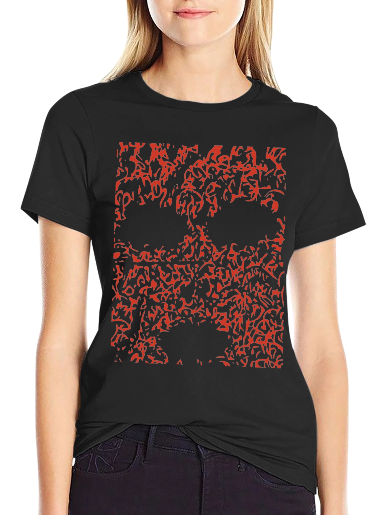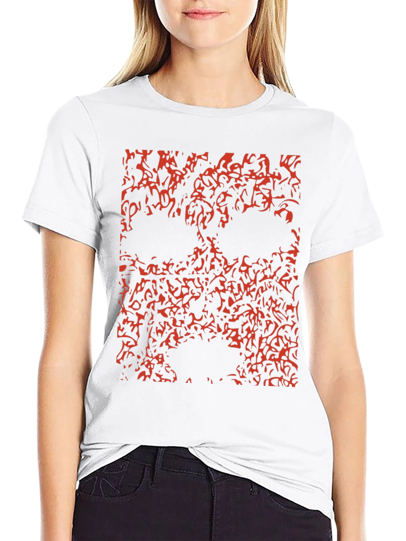 Make a bold statement with this eye-catching black t-shirt featuring an abstract skull design. The intricate red pattern creates a visually striking image of a skull, offering a unique and edgy look. Made from a comfortable-looking cotton blend, this tee is perfect for casual wear or for making a statement at your next event. Pair it with jeans or shorts for a versatile, standout style. Add this artistic tee to your wardrobe today!