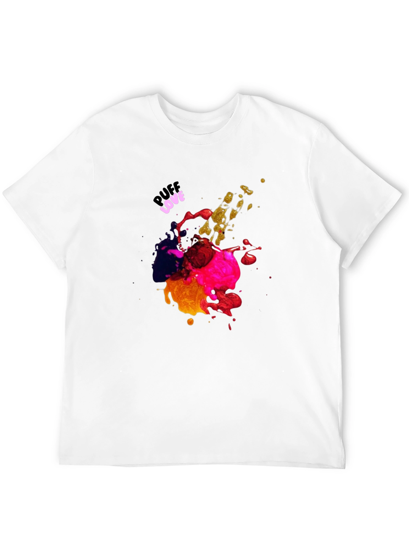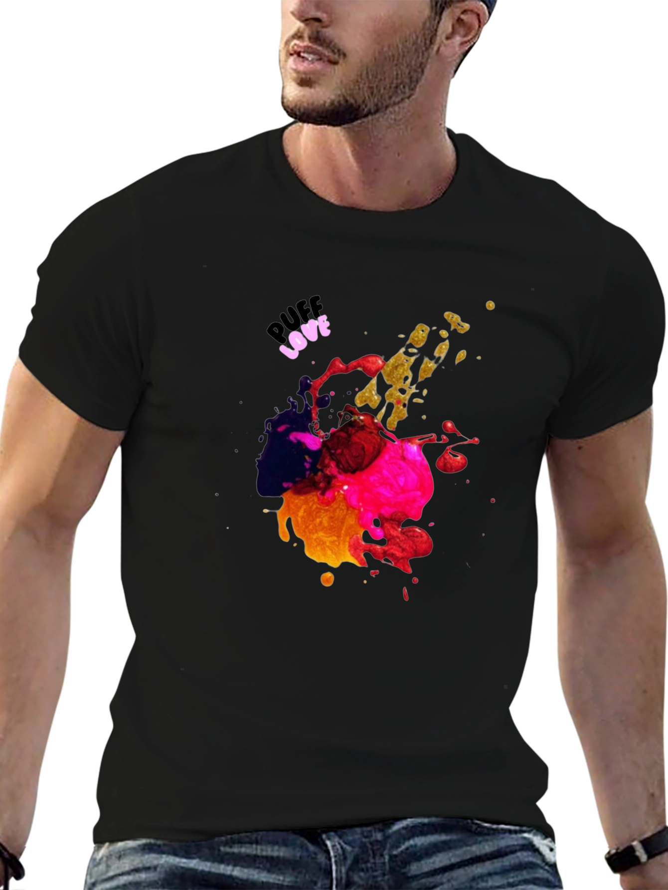 Make a bold statement with this eye-catching black t-shirt. It features a vibrant, abstract splatter design in a variety of colors including gold, pink, red, orange, and blue. Above the design, you can see the faint words "pure love." The design gives this classic tee a modern, artistic edge. Perfect for casual wear, concerts, or expressing your unique style. Pair it with jeans, shorts, or joggers for a versatile look. Made from comfortable, breathable fabric for all-day wear, this tee is sure to turn heads and become a favorite in your wardrobe.