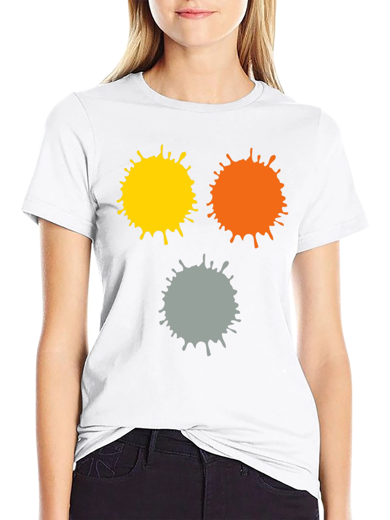 Make a statement with this striking black t-shirt featuring a unique, abstract splatter design. The shirt showcases three prominent paint splatters in eye-catching yellow, orange, and gray, arranged in a visually appealing pattern. Made from a comfortable, breathable fabric, this tee is perfect for everyday wear. This eye-catching design adds a pop of color and personality to any outfit, making it a great conversation starter. Ideal for casual outings, concerts, or just lounging around, this t-shirt is a versatile addition to your wardrobe. Its bold design and comfortable fit make it a standout piece that's sure to turn heads.