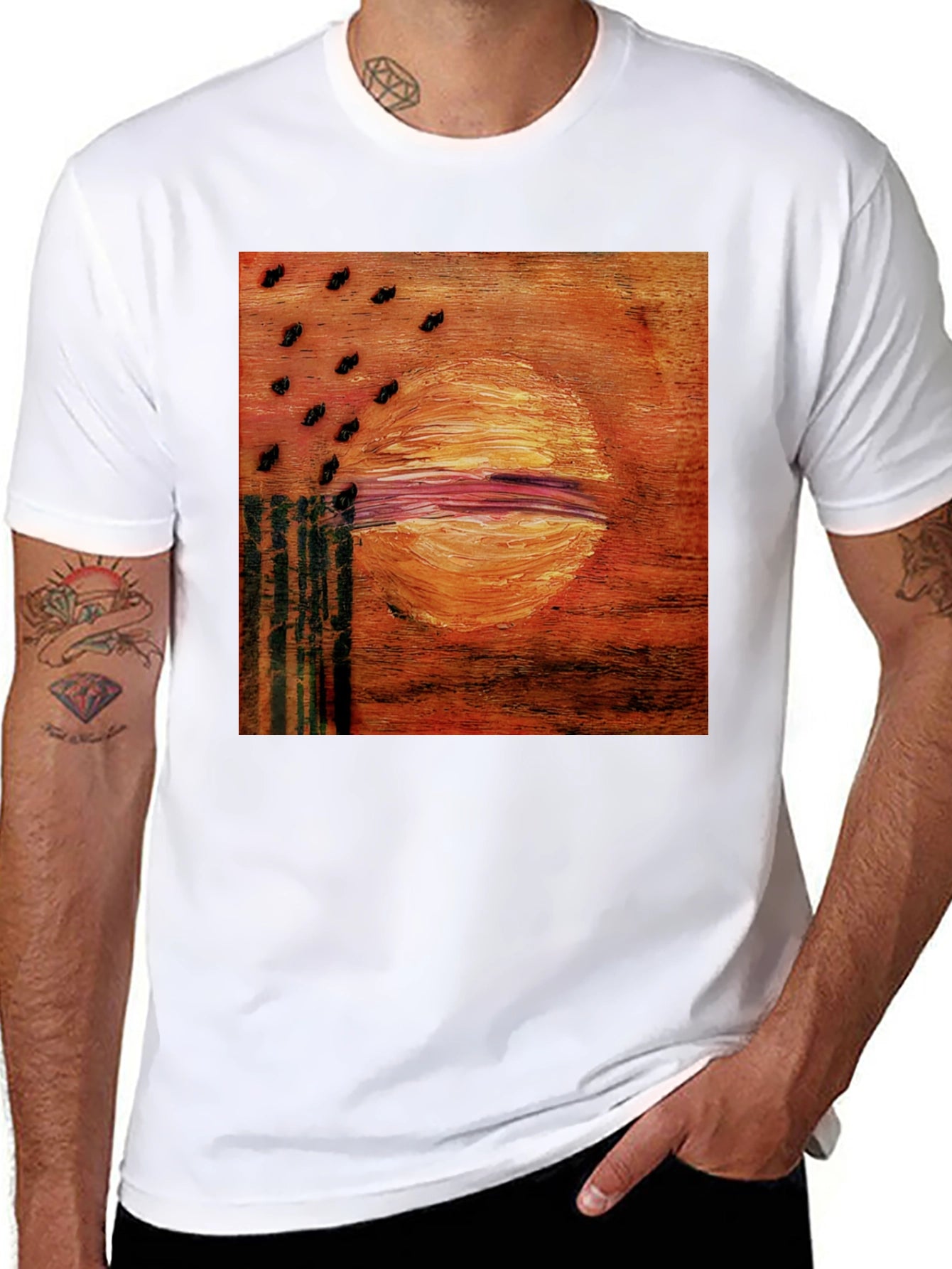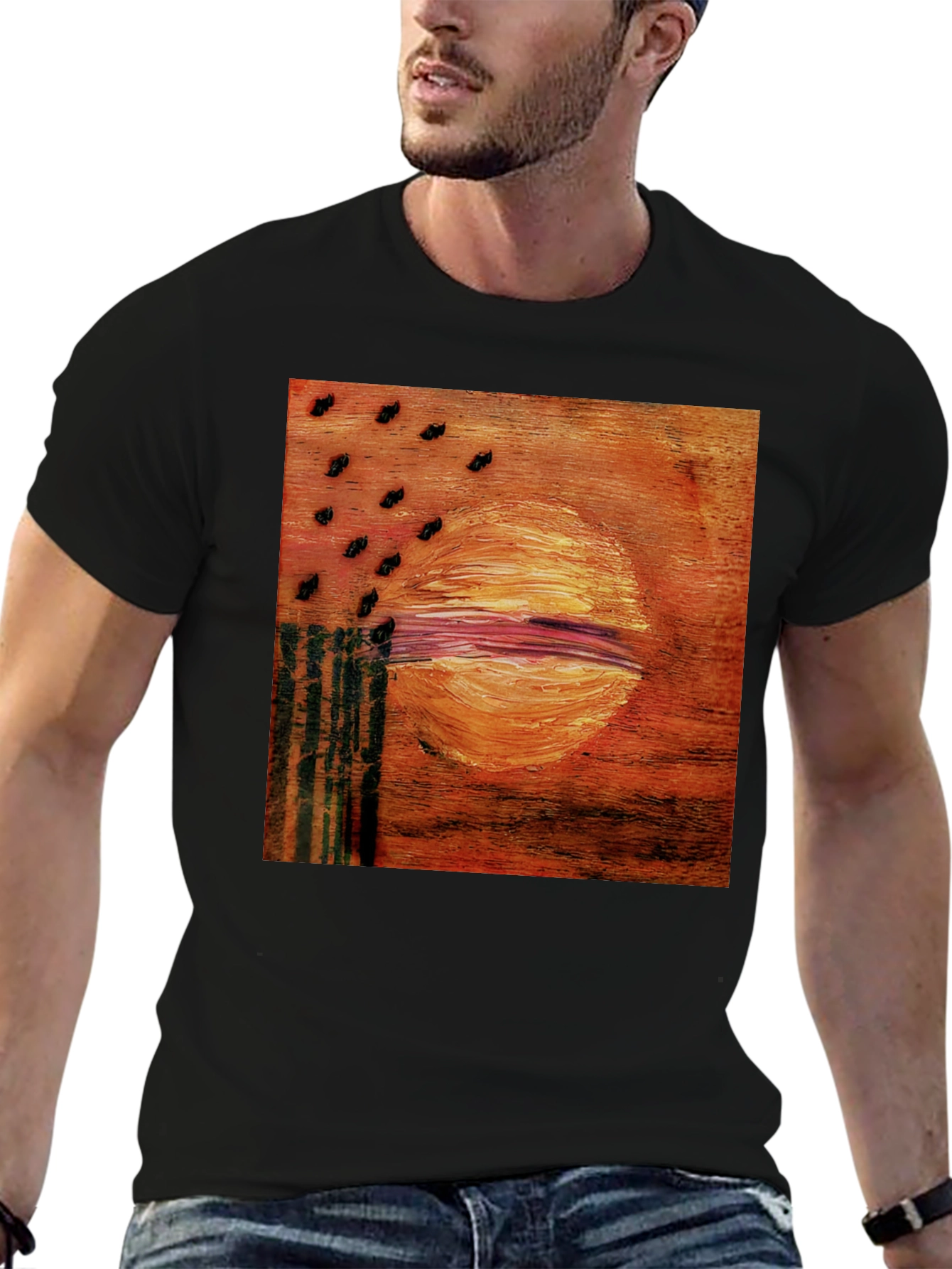 Elevate your style with this unique black tee featuring an eye-catching abstract sun graphic. The artwork showcases a vibrant orange and red sun design, accented by rows of dark, textured elements. The use of thick brushstrokes adds depth and visual interest. Crafted from a soft, breathable cotton blend, this tee offers all-day comfort and durability. Perfect for casual outings, art enthusiasts, or anyone looking to make a bold statement. Pair it with your favorite jeans or shorts for an effortlessly cool look. Add this standout piece to your wardrobe today!