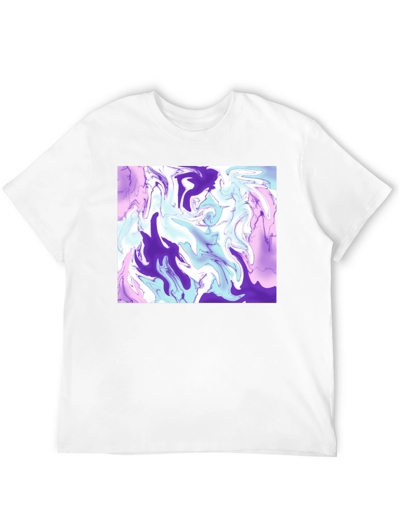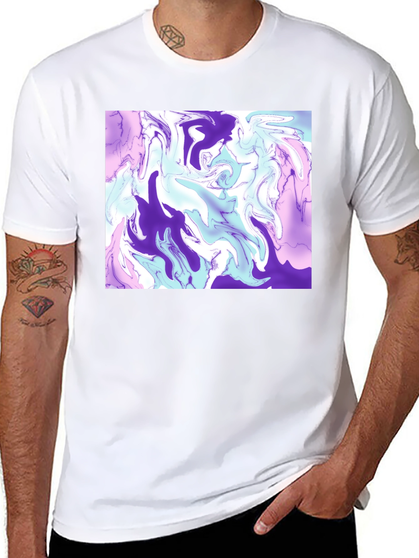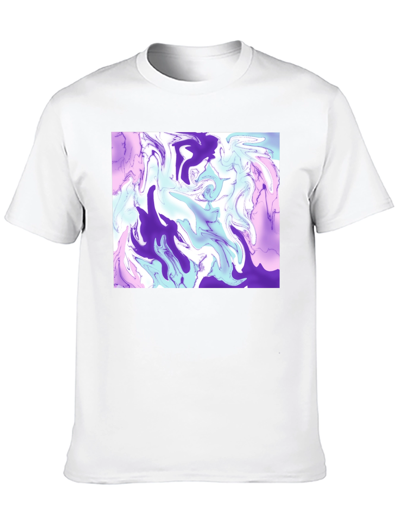 Elevate your casual wardrobe with this eye-catching t-shirt. Featuring a unique abstract swirl design in shades of purple, white, and blue, this tee is sure to make a statement. The smooth, soft-looking fabric suggests a comfortable fit, perfect for everyday wear. The classic crew neck and short sleeves make it versatile for layering or wearing on its own. Dress it up with a blazer or keep it casual with jeans—this tee is a stylish and comfortable choice for any occasion. Ideal for those who appreciate modern art and distinctive fashion.
