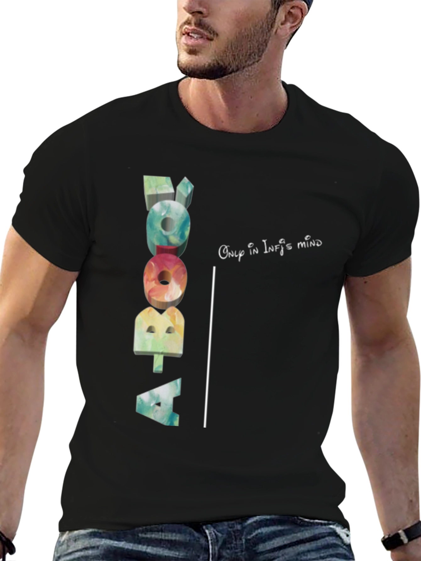 Show off your unique style with this black graphic t-shirt. This tee features a vertically stacked, abstract 'YOBOTA' design on the front, rendered in a colorful, watercolor-like pattern. Alongside is written 'Only in Infj's Mind' The design adds a touch of artistic flair to your casual wardrobe. Made from a comfortable-looking material, this t-shirt is perfect for everyday wear. Pair it with jeans or shorts for a relaxed, effortlessly cool look. This tee is a must-have for anyone looking to express their individuality.