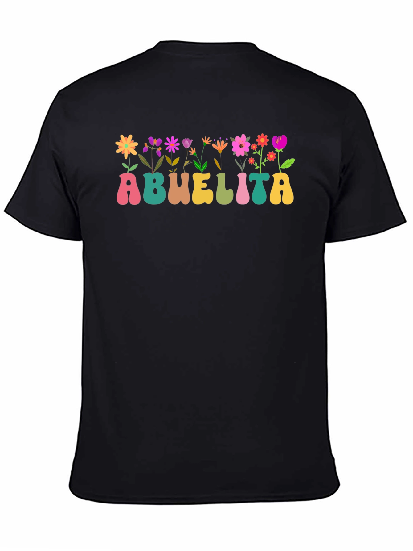 This stylish black t-shirt features the word "Abuelita" in bold, colorful, retro-style lettering, accented with whimsical floral designs above each letter. The vibrant colors and playful font give it a fun, groovy vibe. Perfect for showing appreciation for a special grandmother, this shirt is both comfortable and eye-catching. It's made from what appears to be a soft, breathable fabric, making it ideal for everyday wear. Dress it up or down – wear it to family gatherings, casual outings, or simply as a fun statement piece. A delightful gift idea that’s sure to bring a smile!