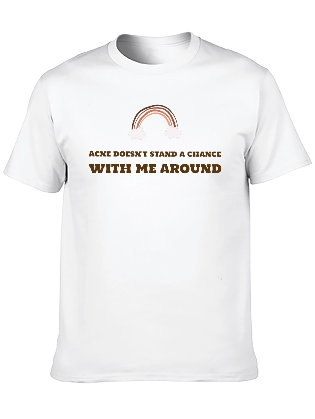 This stylish black t-shirt features a unique and playful design. At the center is a charming brown rainbow with cloud accents. Bold text proclaims, "ACNE DOESN'T STAND A CHANCE WITH ME AROUND," making it a fun and confident statement piece. The shirt appears to be made of soft, comfortable fabric, perfect for casual wear. Ideal for anyone with a great sense of humor and a positive attitude, this tee is sure to turn heads. Wear it to school, the park, or just hanging out with friends. Show off your confidence and let everyone know that you're ready to take on the world, one clear complexion at a time!