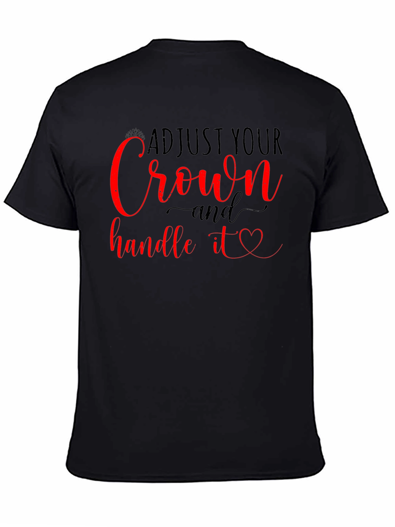 Show your inner strength with this stylish black t-shirt! Featuring a bold red graphic that reads "Adjust Your Crown and handle it" in an elegant, eye-catching font, this tee makes a powerful statement. The design is perfect for those who embrace confidence and resilience. Made from a soft, breathable fabric, this classic fit shirt offers all-day comfort. Whether you're conquering challenges or simply expressing your unique style, this motivational tee is a perfect choice. Pair it with your favorite jeans or leggings for a casual yet empowering look. A must-have addition to any wardrobe!