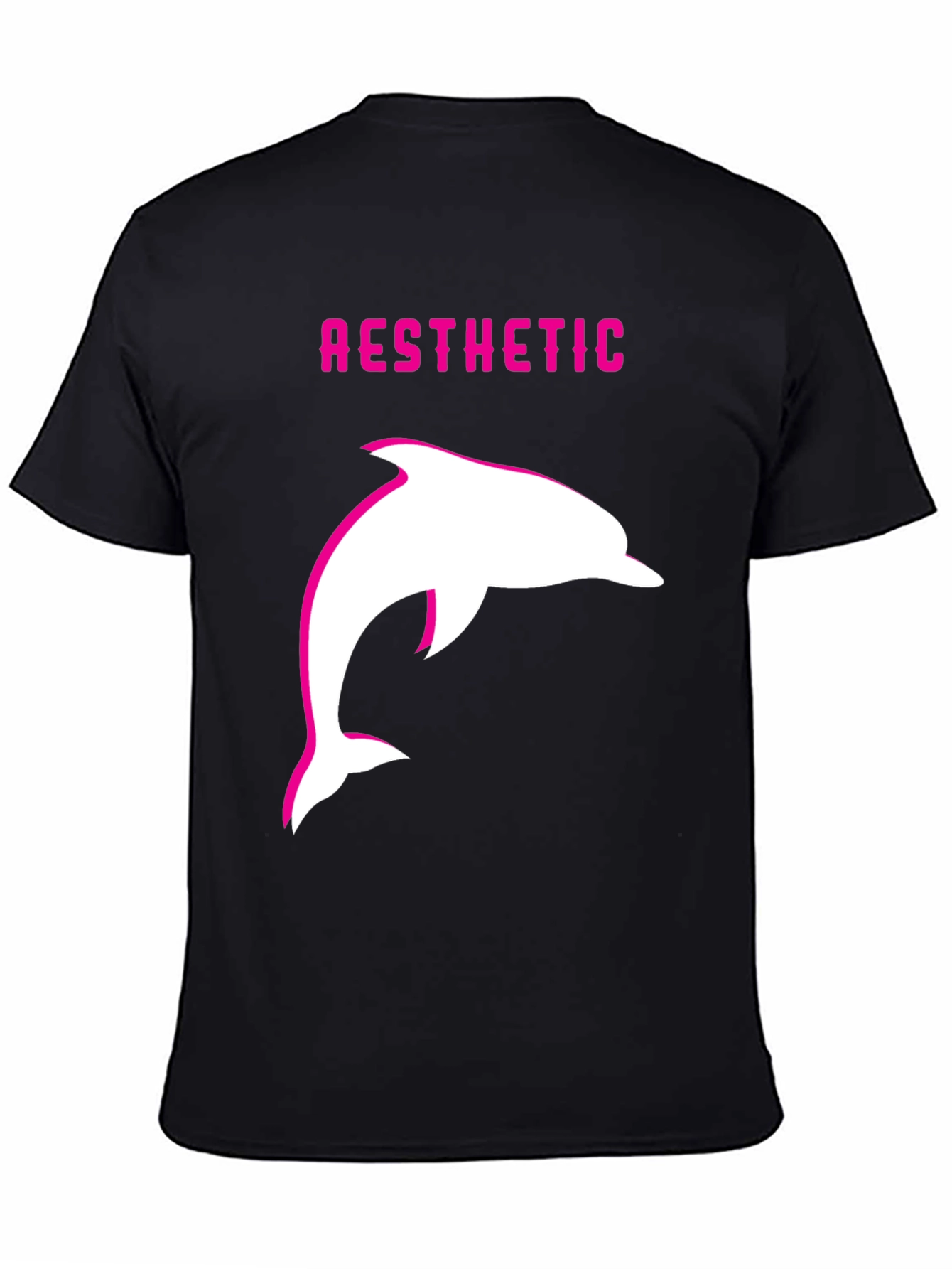 Dive into style with this eye-catching black t-shirt featuring a vibrant "AESTHETIC" text design above a bold white dolphin graphic with a pink shadow outline. The sleek and modern design makes it perfect for casual wear, while the unique color combination ensures you'll stand out from the crowd. Crafted from a soft, comfortable fabric, this tee offers all-day comfort and a great fit. Ideal for anyone looking to add a touch of fun and personality to their wardrobe. Perfect for everyday wear or casual outings, this graphic tee is a must-have for those who want to express their unique style.
