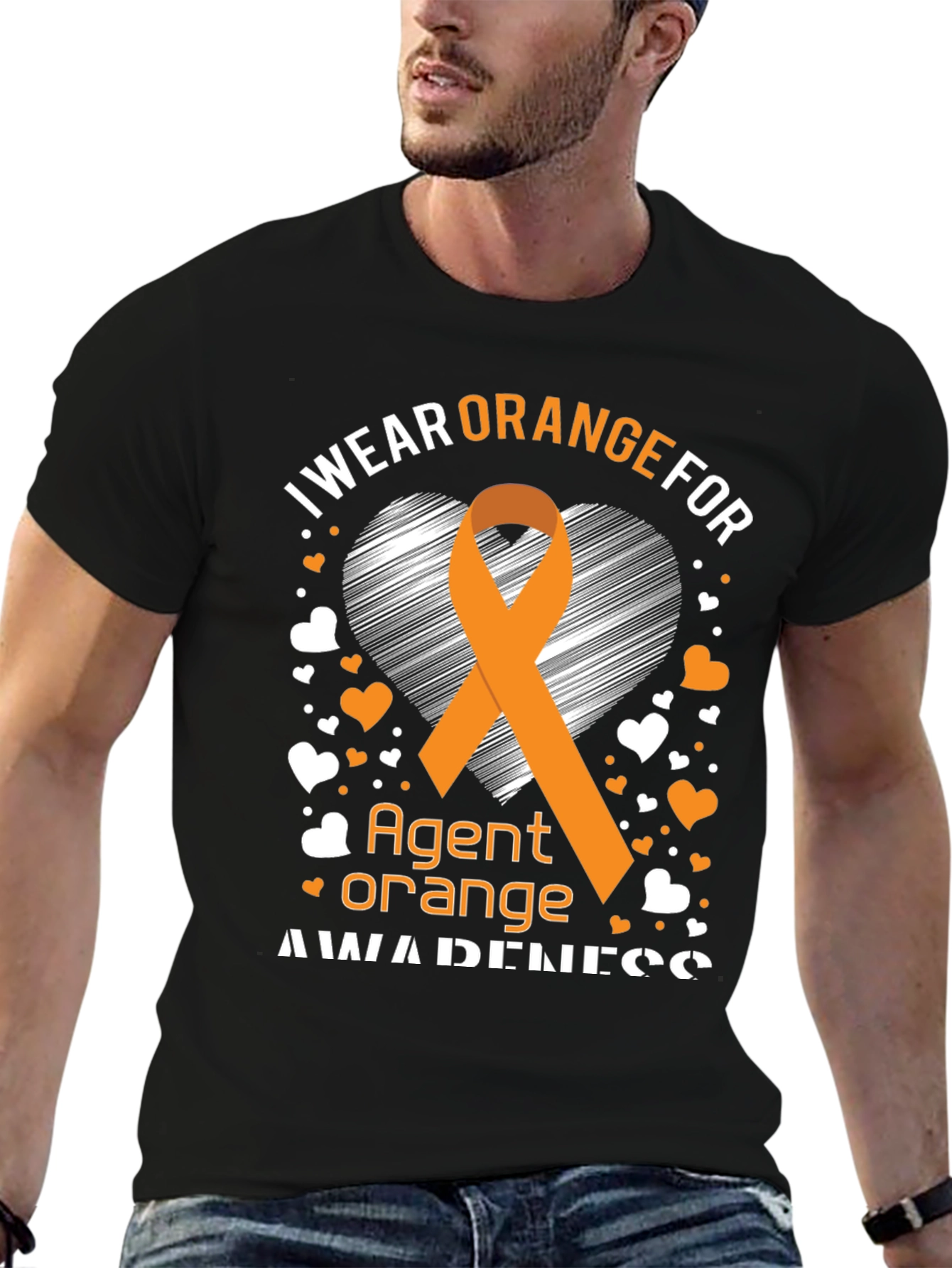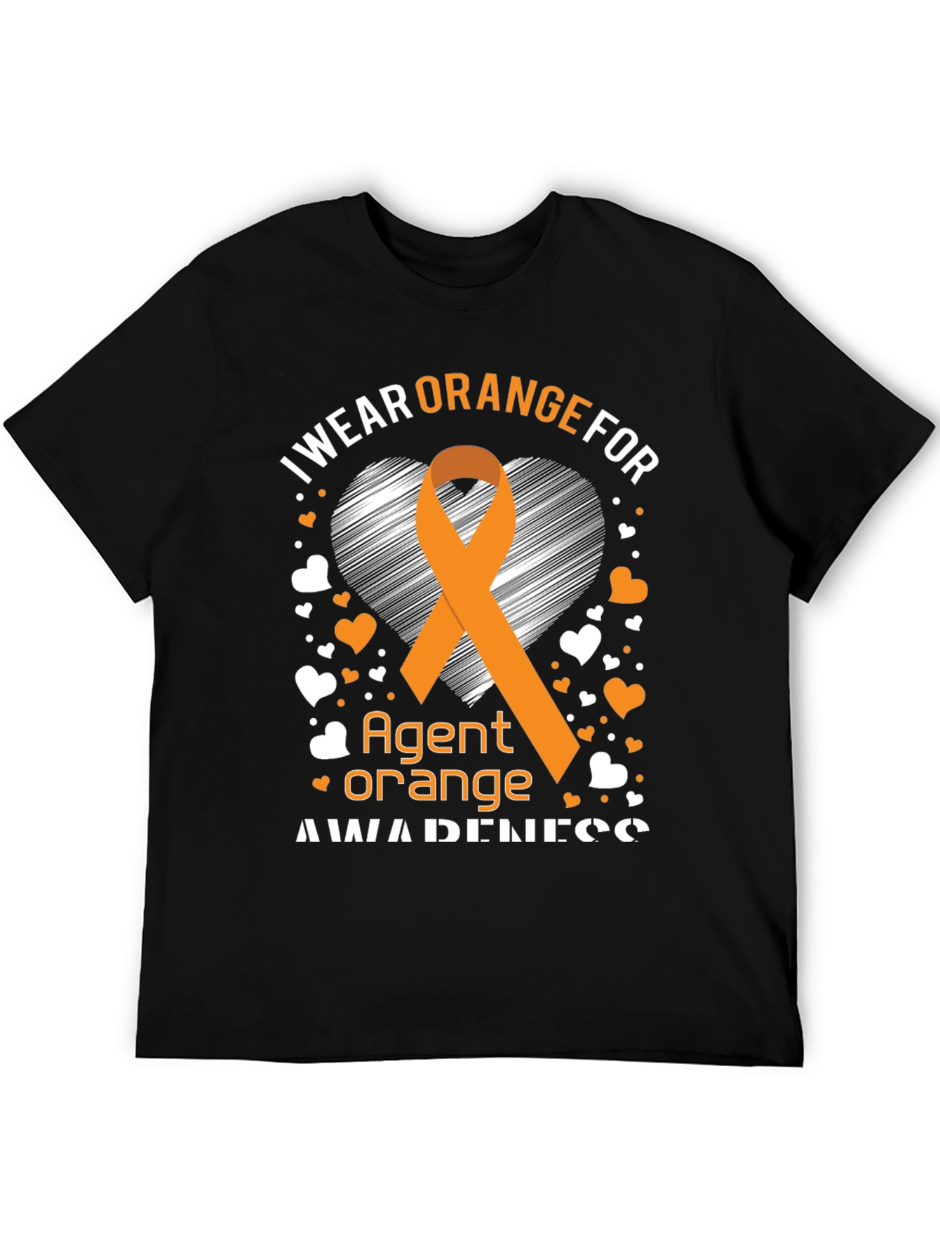 Show your support with this black t-shirt dedicated to Agent Orange awareness. The design features a prominent orange ribbon overlaid on a heart graphic. Embellishing the graphic are scattered hearts, creating a striking visual. "I Wear Orange For Agent Orange Awareness" is printed on the tee in bold lettering, making a statement. Made from a soft-looking cotton blend, this tee offers both comfort and durability. Perfect for awareness events, casual wear, or as a thoughtful gift. Available in various sizes.