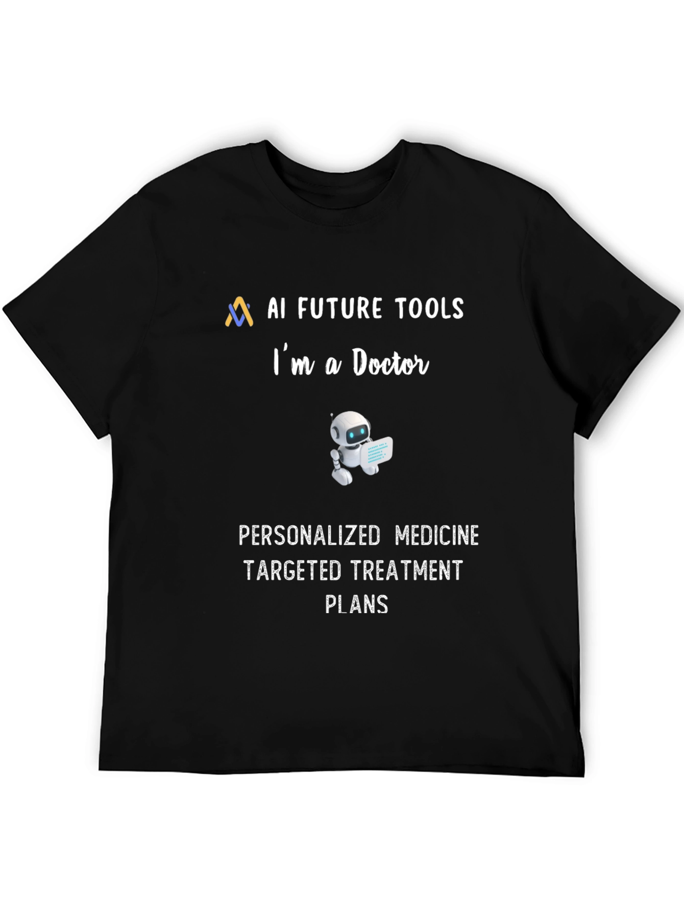 This black t-shirt features a bold design incorporating elements of artificial intelligence and medicine. The graphic includes the text 'AI FUTURE TOOLS', 'I'm a Doctor', and 'PERSONALIZED MEDICINE TARGETED TREATMENT PLANS', alongside an adorable robot doctor graphic. The design suggests a futuristic approach to healthcare. Made from a comfortable-looking fabric, this t-shirt would be perfect for anyone interested in technology, medicine, or the intersection of both. Wear it to conferences, casual outings, or as a conversation starter about the future of healthcare.