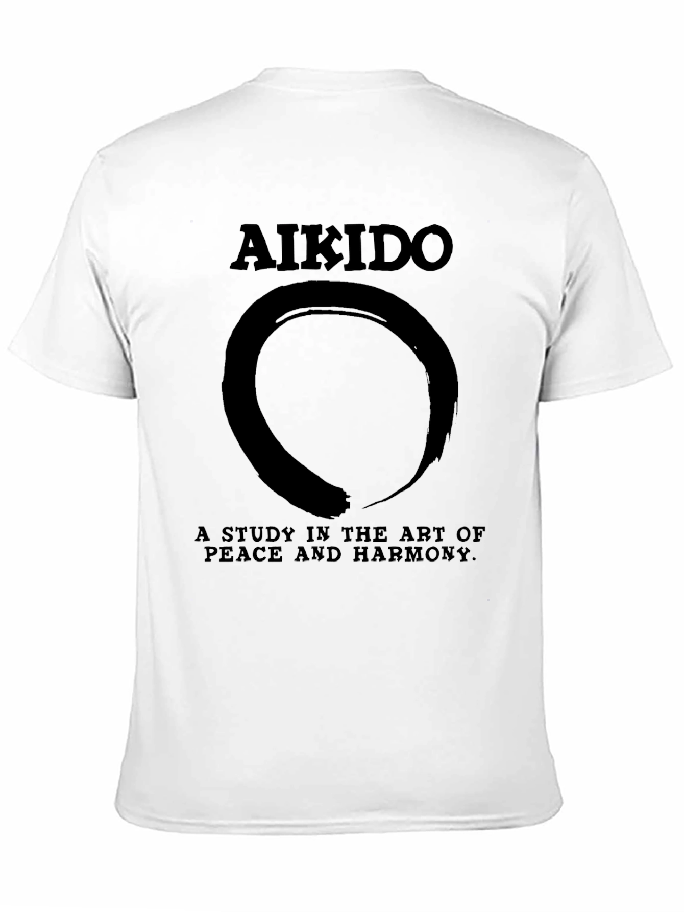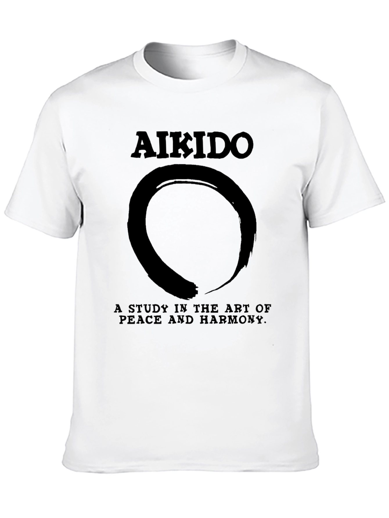 Showcase your love for Aikido with this stylish black t-shirt. Featuring the word "Aikido" prominently at the top, the shirt is adorned with a striking Zen circle design, symbolizing enlightenment, strength, and elegance. Below the circle, the phrase "A STUDY IN THE ART OF PEACE AND HARMONY" completes the powerful message. Made from a comfortable, breathable fabric, this t-shirt is perfect for everyday wear, training sessions, or as a thoughtful gift for martial arts enthusiasts. The classic black color ensures it pairs effortlessly with any outfit. Embrace the spirit of Aikido with this unique and meaningful tee.