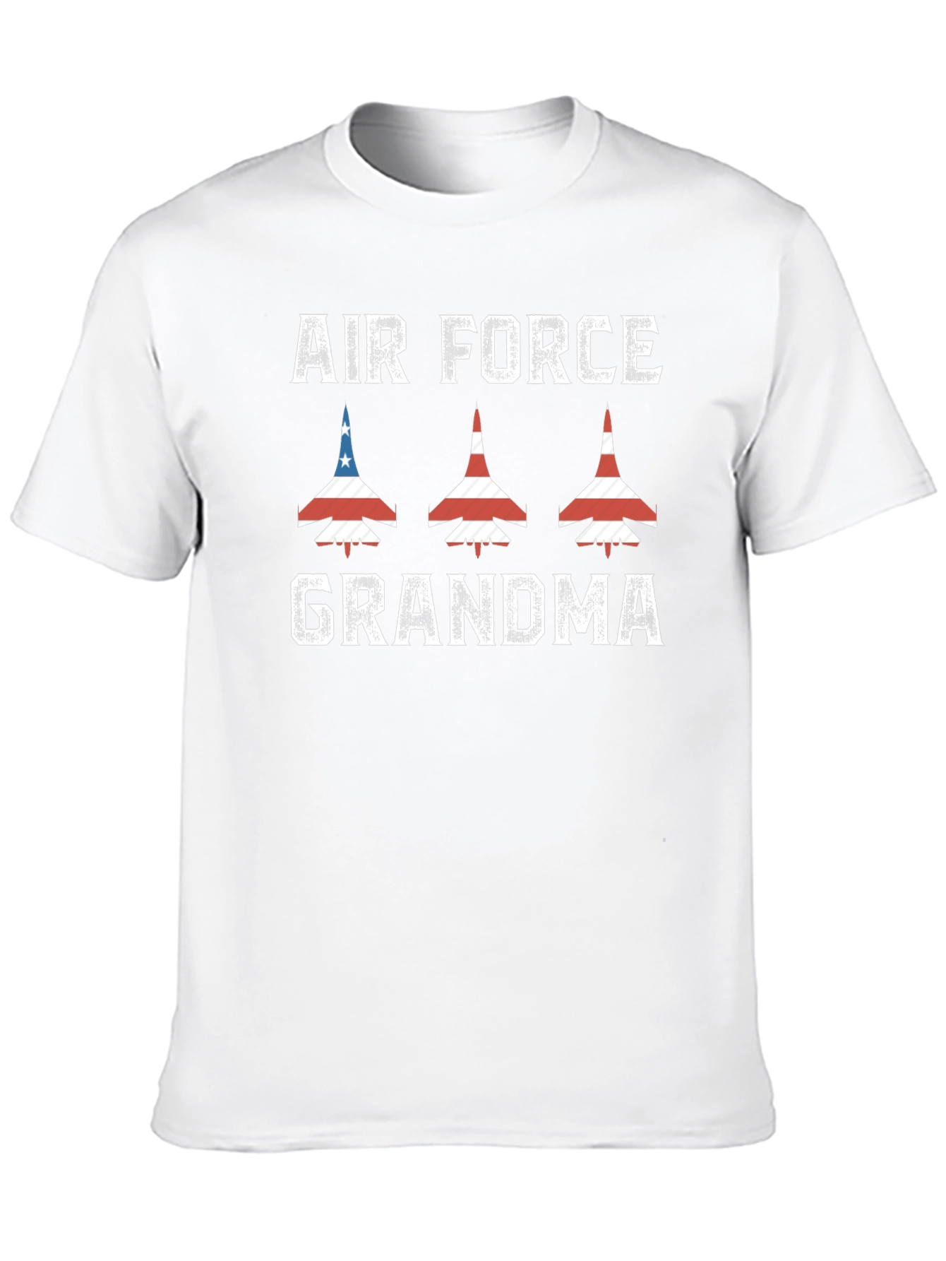 Show your Air Force pride with this unique "Air Force Grandma" t-shirt. The design features the words "Air Force Grandma" printed in a bold, distressed font. The graphic includes airplane silhouettes decorated with patriotic American flag patterns. This t-shirt is made from a comfortable, breathable fabric, perfect for everyday wear. The classic crew neck and short sleeve design make it a versatile addition to any wardrobe. Ideal for showing support for your Air Force loved one or celebrating your own service, this t-shirt is a great gift for patriotic grandmothers.