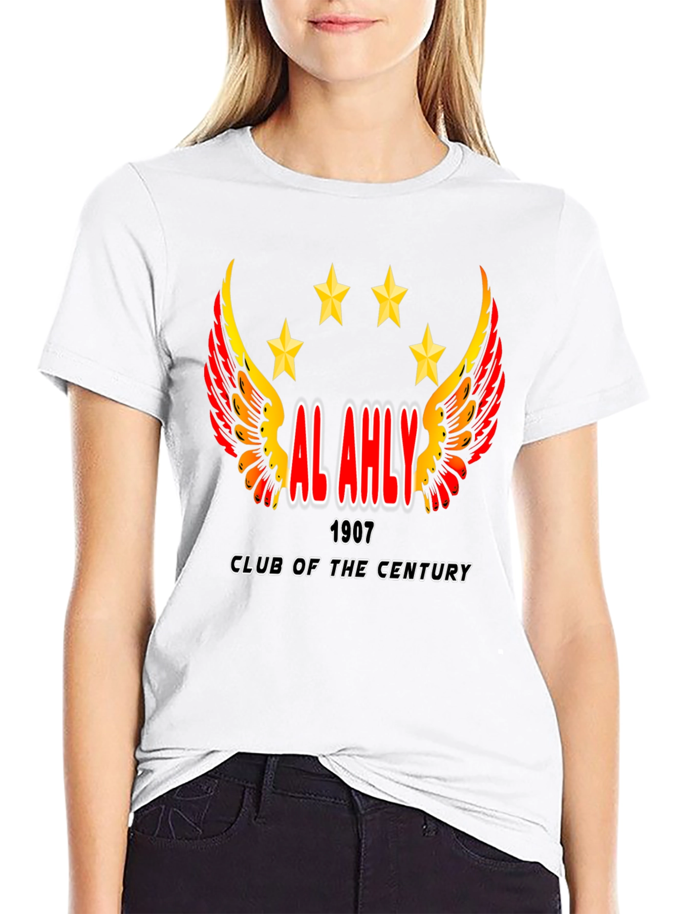 Show your support with this stylish Al Ahly Club t-shirt. The shirt features a bold design of the Al Ahly logo with wings and stars, along with the year 1907 and the phrase 'Club of the Century'. Made from a comfortable black cotton blend, this tee is perfect for casual wear or showing your team pride at games. The vibrant red and gold accents of the logo really pop against the black fabric. Get yours today and cheer on Al Ahly in style!