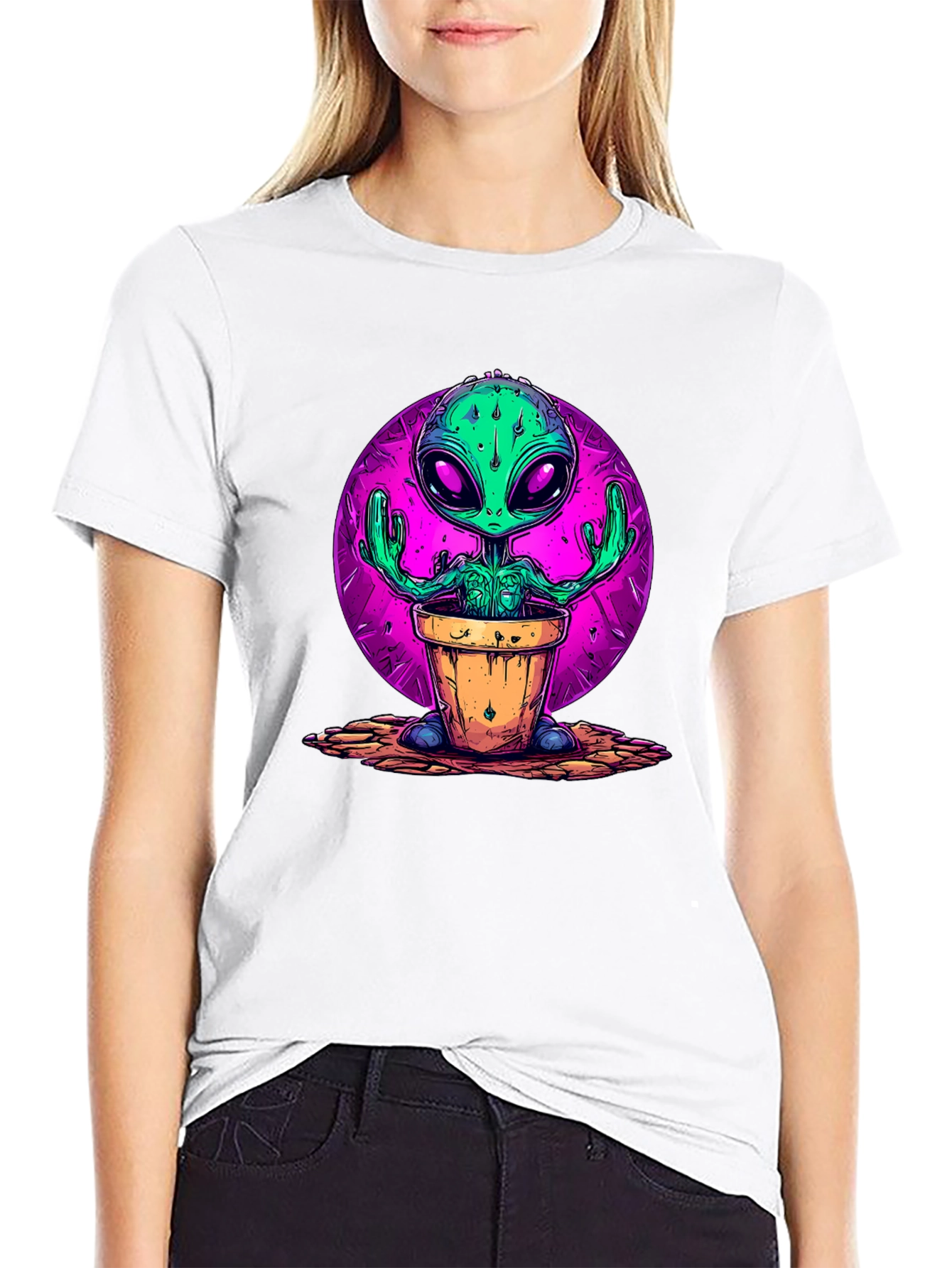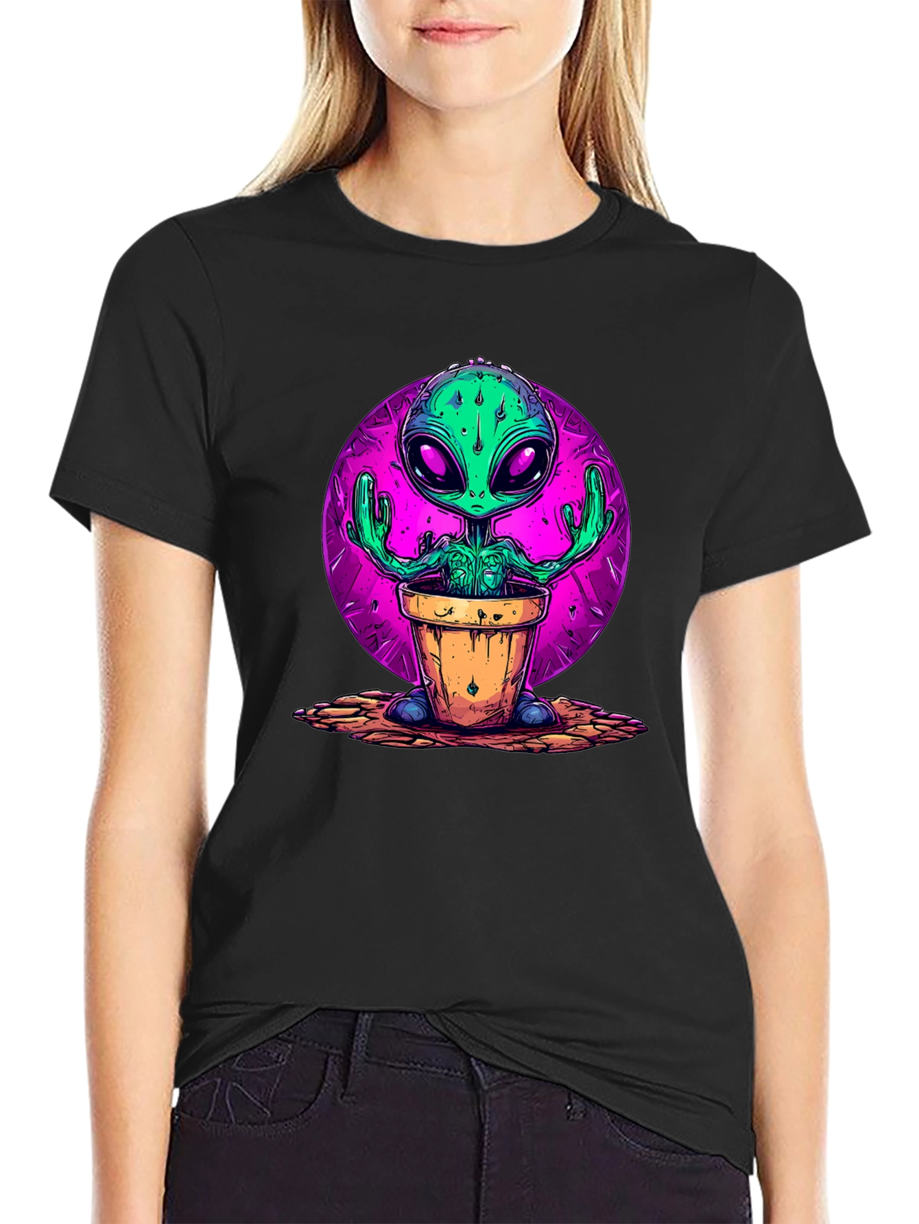 Show off your unique style with this black cotton t-shirt featuring a vibrant graphic of an alien emerging from a pot. The striking design showcases a green alien with large eyes set against a purple and pink backdrop. Crafted from comfortable, breathable cotton, this tee is perfect for casual wear, concerts, or making a statement wherever you go. The detailed and colorful graphic is sure to turn heads and spark conversations. Whether you're a sci-fi enthusiast or just appreciate eye-catching designs, this alien t-shirt is a must-have addition to your wardrobe. Comfortable, stylish, and out of this world!