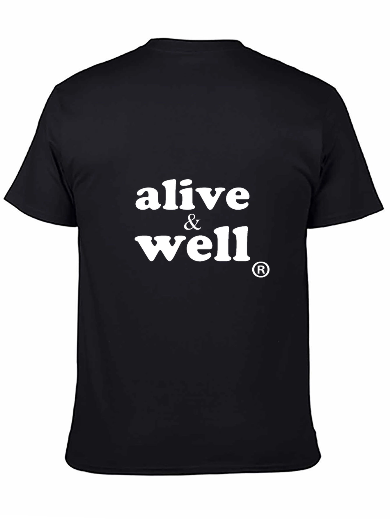 Show off your fun side with this stylish black tee. The shirt features the words "alive & well" in a bold, white, rounded font. It's perfect for casual wear, expressing a positive outlook, or making a statement. The soft fabric ensures a comfortable fit, making it ideal for everyday wear. Pair it with your favorite jeans or shorts for a relaxed and effortlessly cool look. Grab this tee and let the world know you're feeling alive and well!