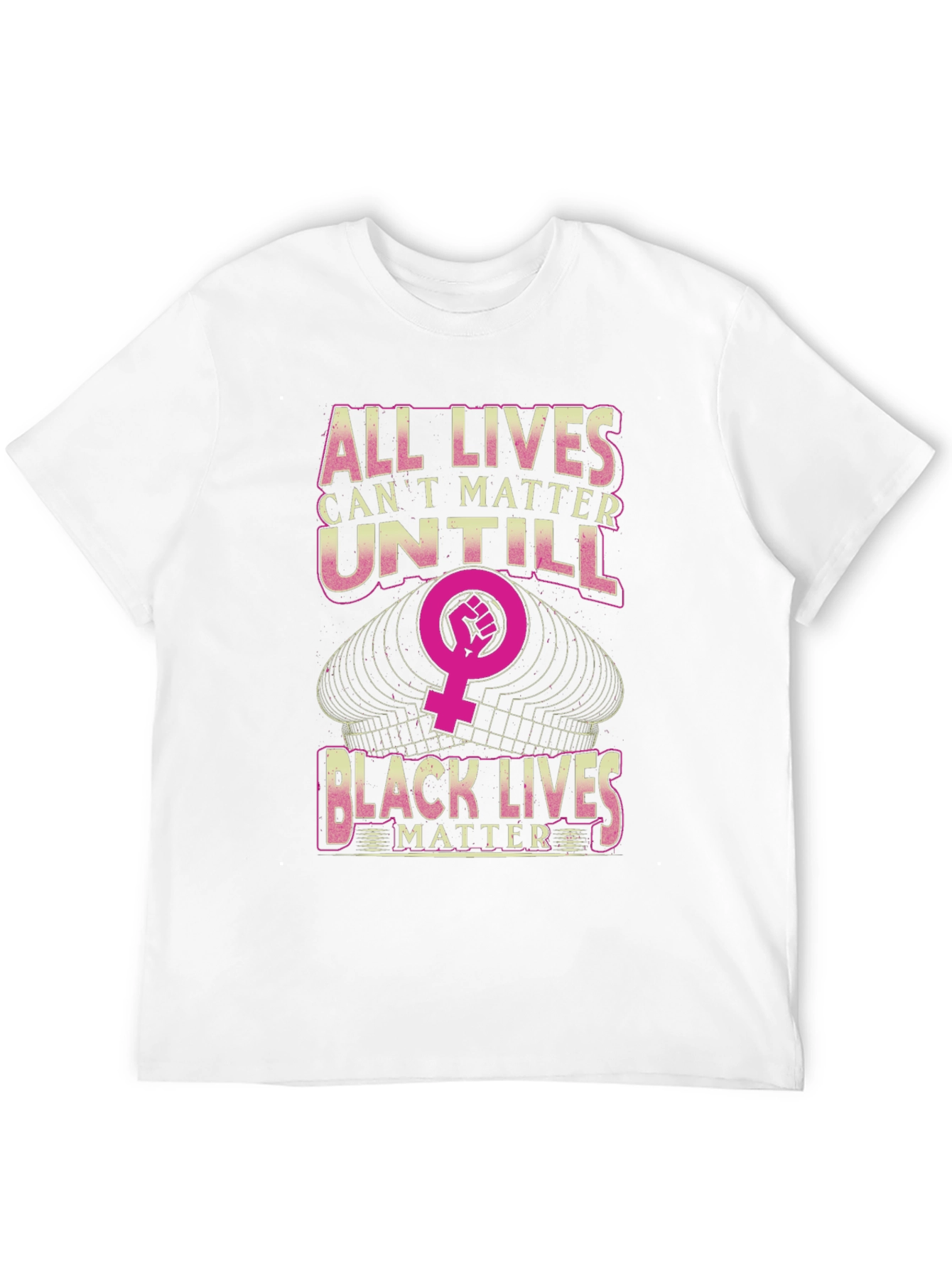 Show your support with this powerful statement t-shirt. The shirt features the phrase "All Lives Can't Matter Until Black Lives Matter" in a bold, eye-catching font. A feminist symbol is present in the design. This tee is perfect for rallies, protests, or everyday wear to raise awareness and promote equality. Made from a comfortable fabric blend, this shirt is both durable and stylish. Wear your values with pride and make a statement with this unique tee.
