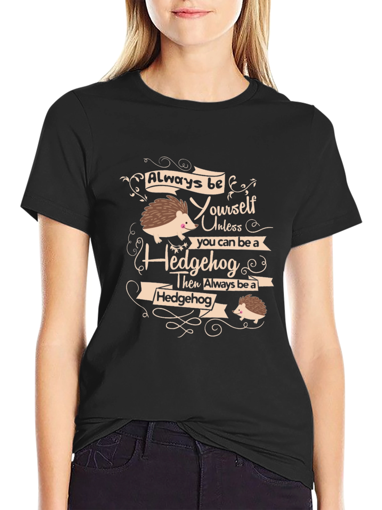 Show off your love for hedgehogs with this fun and stylish t-shirt. Made from a comfortable black fabric, this tee features a whimsical graphic with two adorable hedgehogs and the saying "Always be yourself unless you can be a hedgehog then always be a hedgehog." The design is printed with high-quality ink, ensuring it remains vibrant wash after wash. This shirt is perfect for casual wear, animal lovers, or anyone who wants to add a touch of humor to their wardrobe. It's great for everyday wear, casual outings, or as a unique gift for a friend or family member. Pair it with jeans, shorts, or a skirt for a cute and quirky look.