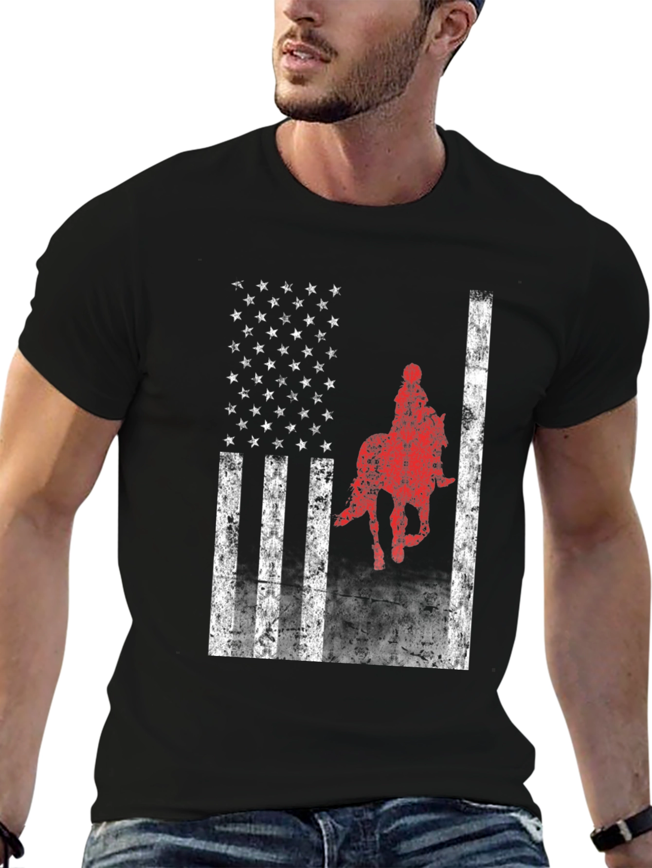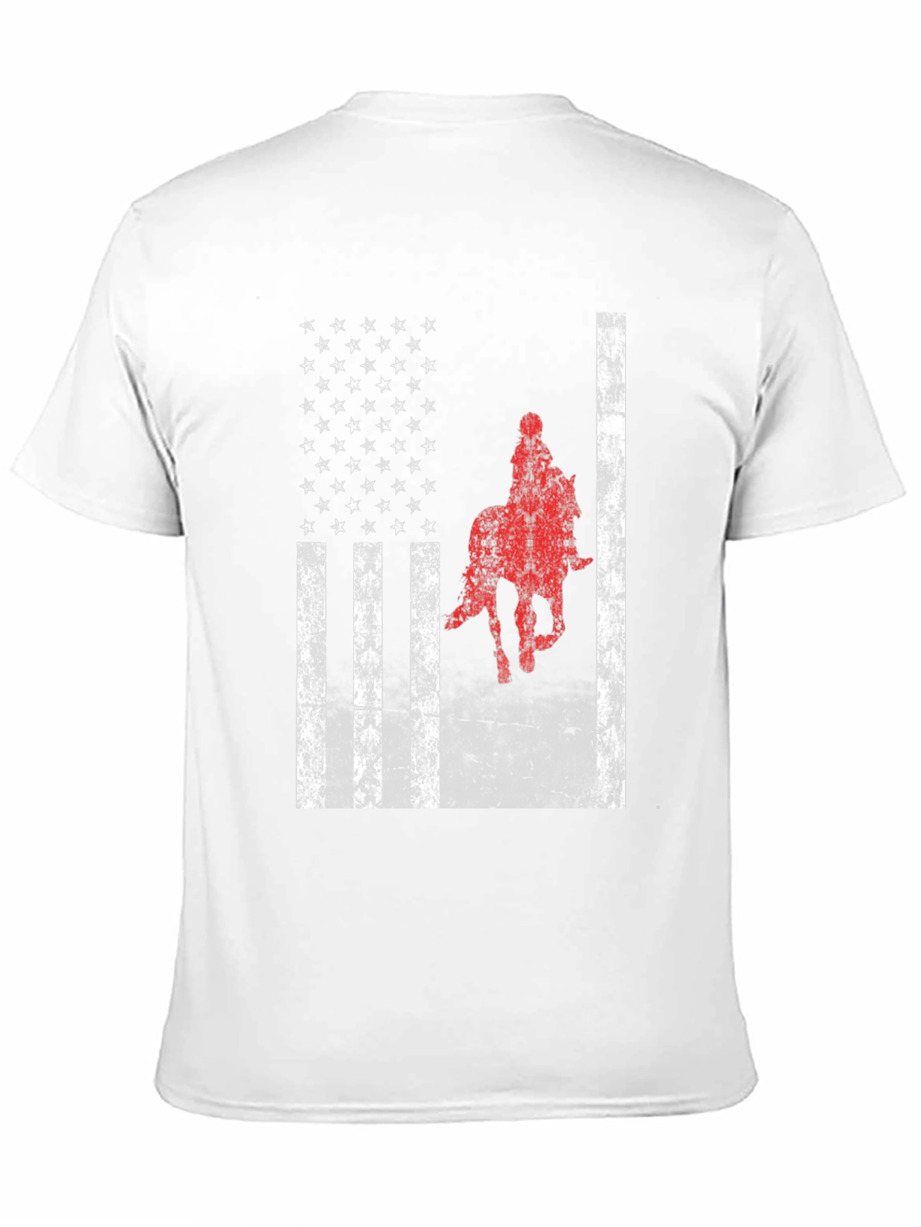 Show your equestrian passion with this unique t-shirt! The design features a distressed American flag graphic with a bold red horse rider silhouette overlayed on the flag. The shirt has a classic crew neck and short sleeves. Made from soft, breathable cotton blend fabric, this tee is comfortable enough for everyday wear. Perfect for horse lovers, rodeo enthusiasts, or anyone wanting to show their American pride. Style it with jeans or shorts for a casual, patriotic look. Grab yours now and wear your passion!