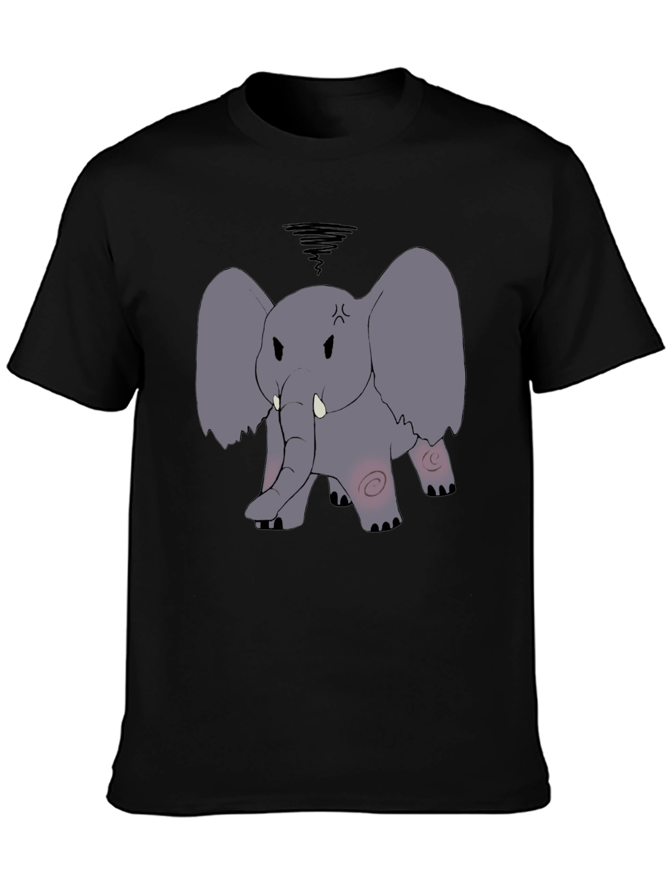 This stylish black t-shirt features a cartoon illustration of an angry gray elephant. The design includes whimsical details like spiral cheeks and furrowed brows, adding a playful touch to the garment. Made from a comfortable-looking fabric, this tee is perfect for casual wear. Show off your unique sense of humor with this eye-catching piece. Ideal for animal lovers and cartoon enthusiasts alike. Whether you're lounging at home or heading out with friends, this t-shirt is sure to turn heads and spark conversations.