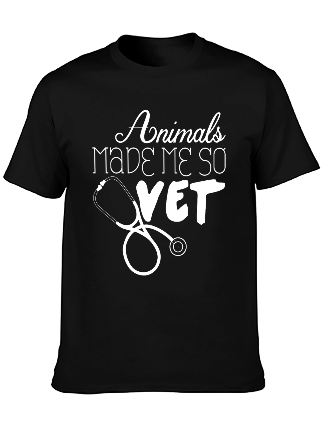 Show off your love for animals with this stylish black t-shirt. Featuring a creative design that incorporates a stethoscope with the humorous message "Animals Made Me So Vet", this shirt is perfect for veterinarians, vet techs, and animal enthusiasts alike. The design is printed in crisp white lettering, providing a striking contrast against the dark fabric. Made from a comfortable material, this tee is ideal for everyday wear, work, or casual outings. A fun and unique way to express your passion for animal care!