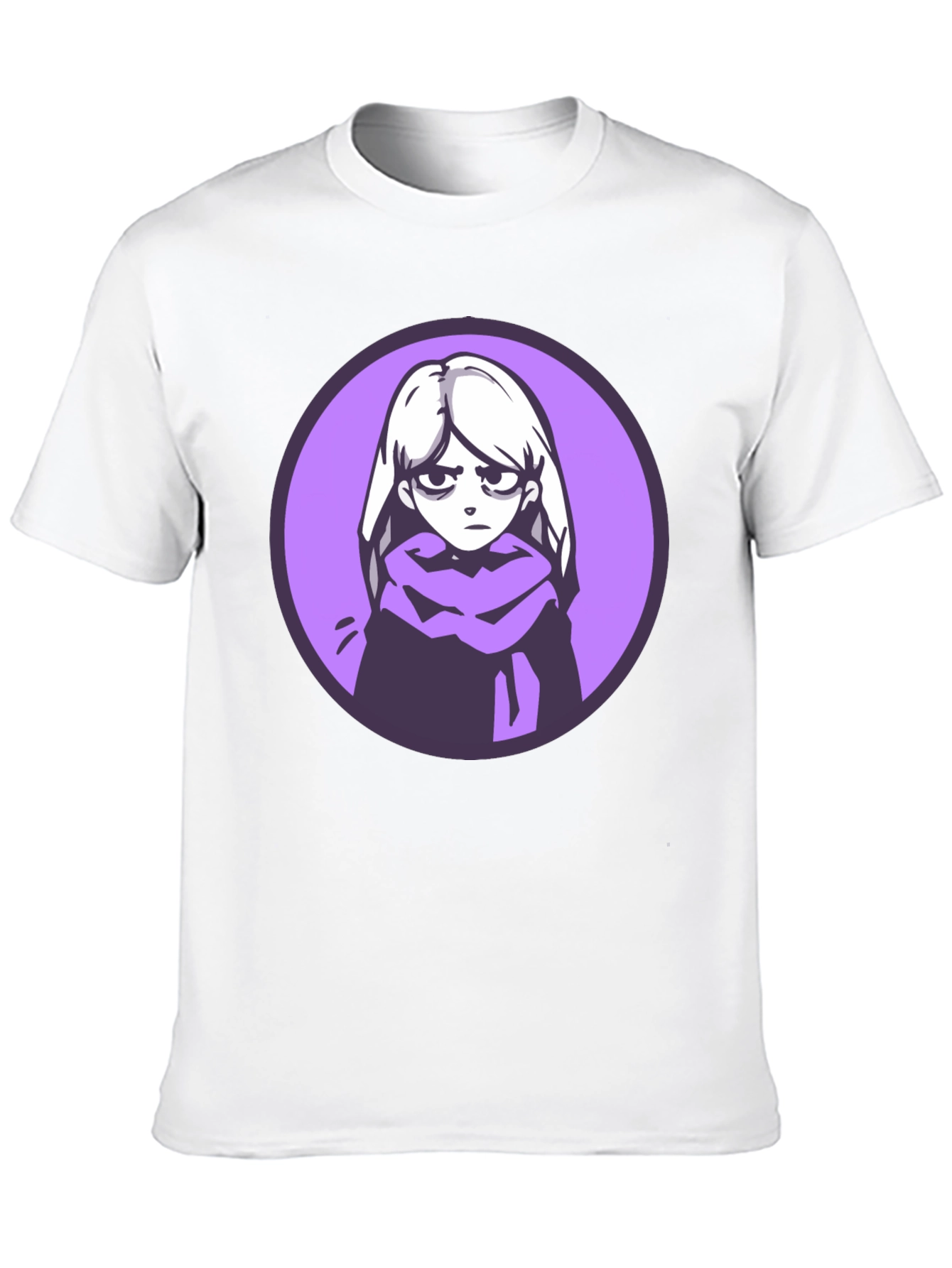 Show off your unique style with this eye-catching black t-shirt. The shirt features a bold graphic of a cartoon girl with a sullen expression set against a contrasting purple circular background. The design adds a playful yet edgy vibe. Made from a comfortable cotton blend, this tee is perfect for everyday wear. Pair it with jeans for a casual look, or dress it up with a jacket for a night out. Express your individuality with this unique statement piece. A cool gift idea for fans of anime-inspired graphic tees.