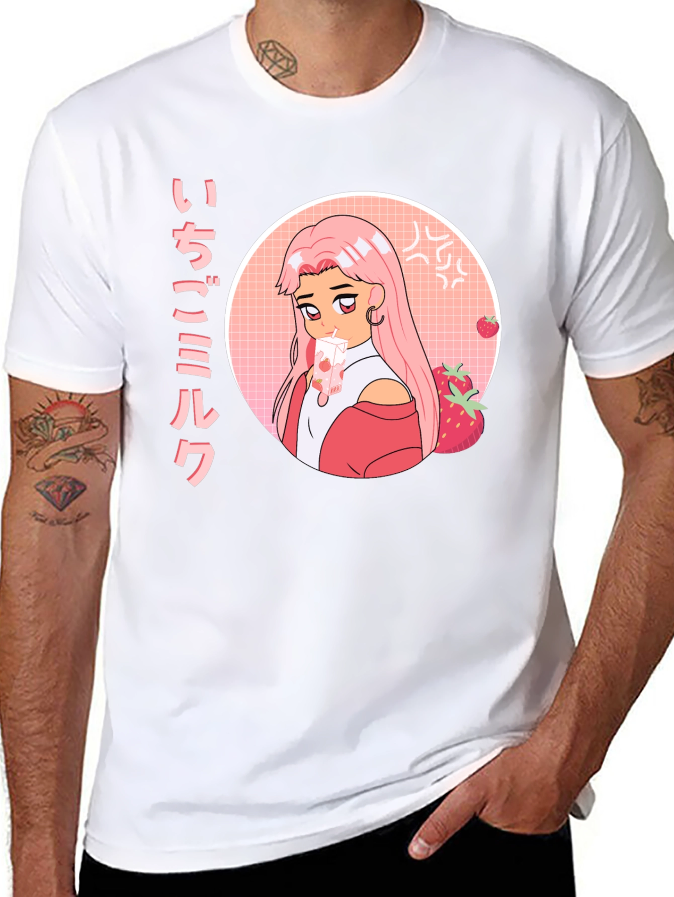 This stylish black t-shirt features an anime-inspired graphic of a girl enjoying strawberry milk. The design includes Japanese text and a cute strawberry background. Made from a comfortable, breathable fabric, this t-shirt is perfect for casual wear, expressing your unique style, or as a gift for anime lovers. The bold print adds a playful touch to any outfit, making it ideal for everyday wear, lounging at home, or meeting up with friends. Show off your love for anime with this unique and eye-catching t-shirt.