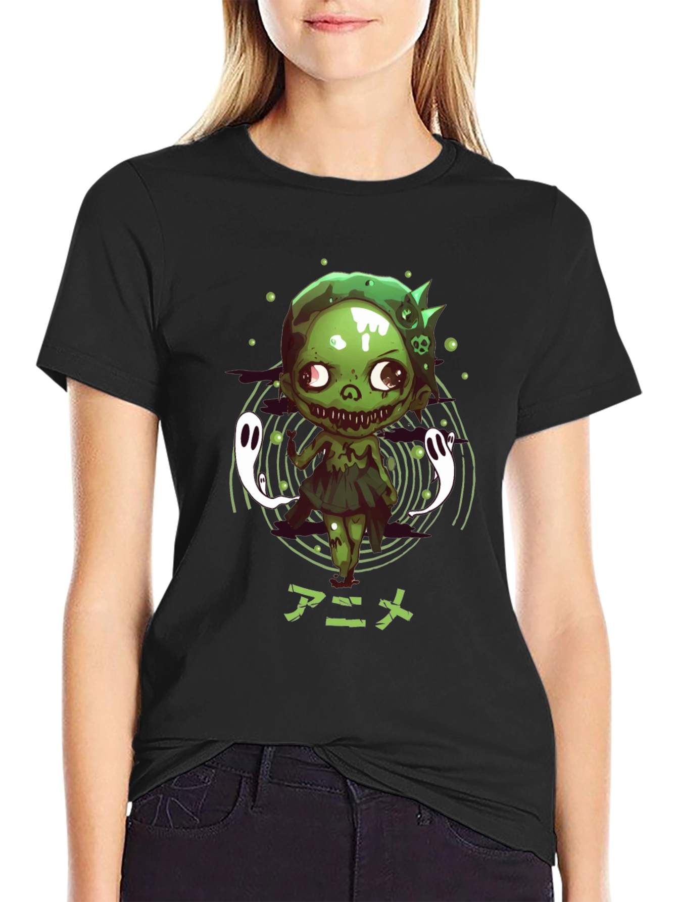Show off your unique style with this eye-catching black T-shirt. Featuring a vibrant, cartoonish graphic of a zombie character and two ghosts with anime lettering below, this shirt is sure to turn heads. The bold design is printed on a soft and comfortable fabric, perfect for casual wear. This unique tee is great for expressing your individuality, making a statement, or wearing to a convention or party. This tee is a must-have for anime fans and lovers of alternative fashion.
