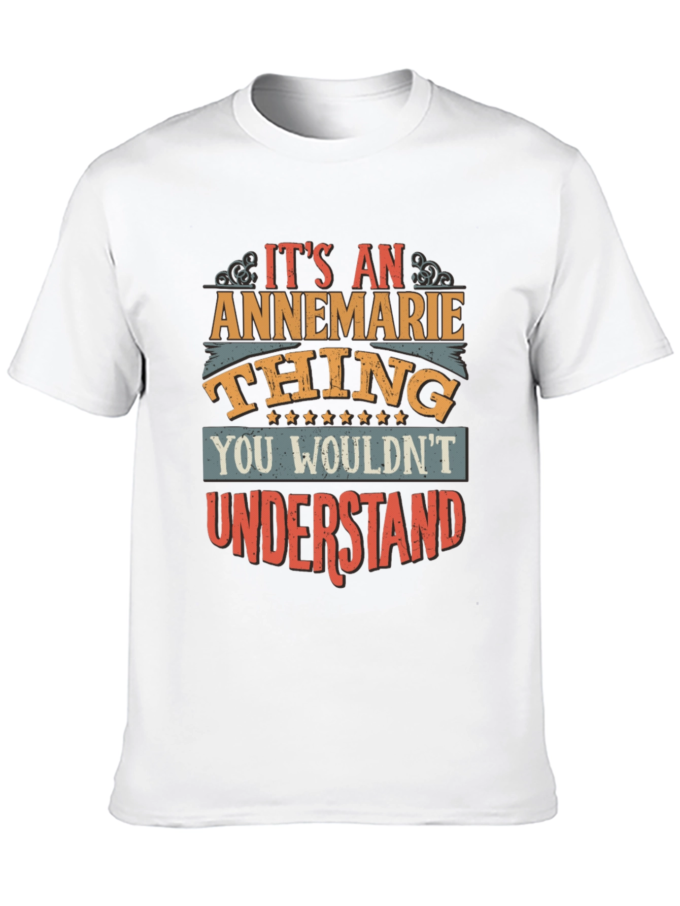 This stylish black t-shirt features a unique graphic design that reads "It's an Annemarie Thing You Wouldn't Understand." The design incorporates retro fonts and colors, giving it a vintage feel. Made from a comfortable fabric, this tee is perfect for casual wear and makes a statement. The design is eye-catching, and the wearer is sure to stand out. Great for everyday wear or as a gift for someone named Annemarie with a great sense of humor. Show off your unique style with this fun and comfortable t-shirt.