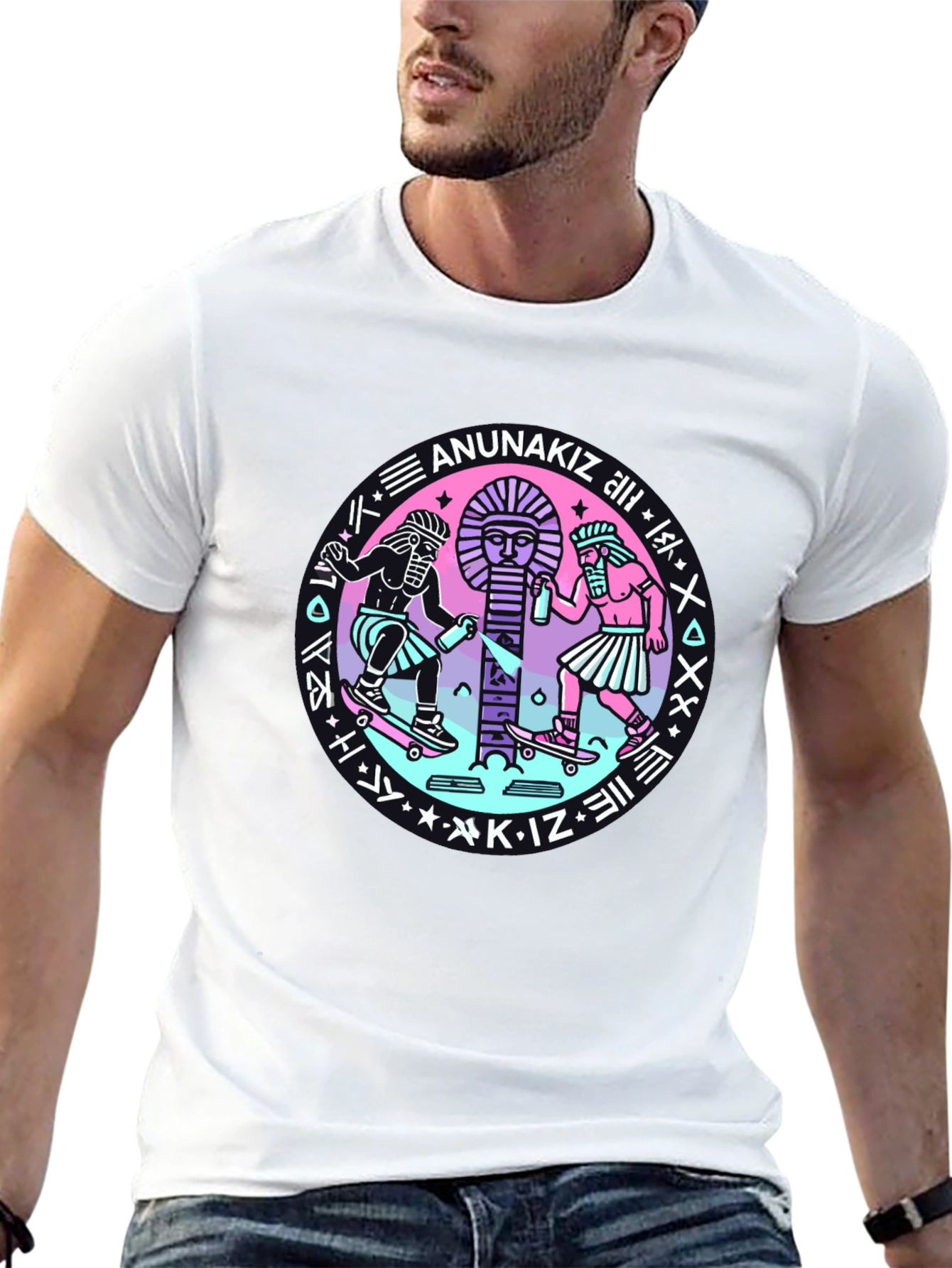 Show off your unique style with this eye-catching graphic tee. This black t-shirt features a vibrant and intricate circular design with an Anunakiz theme. The design showcases two figures on skateboards, and a center column. It's a stand-out piece that's sure to spark conversation. Made from what appears to be a comfortable, breathable cotton blend, this tee is perfect for everyday wear or a casual night out. Pair it with jeans, shorts, or layer it under a jacket for a versatile look. Grab this awesome tee for yourself or as a gift!