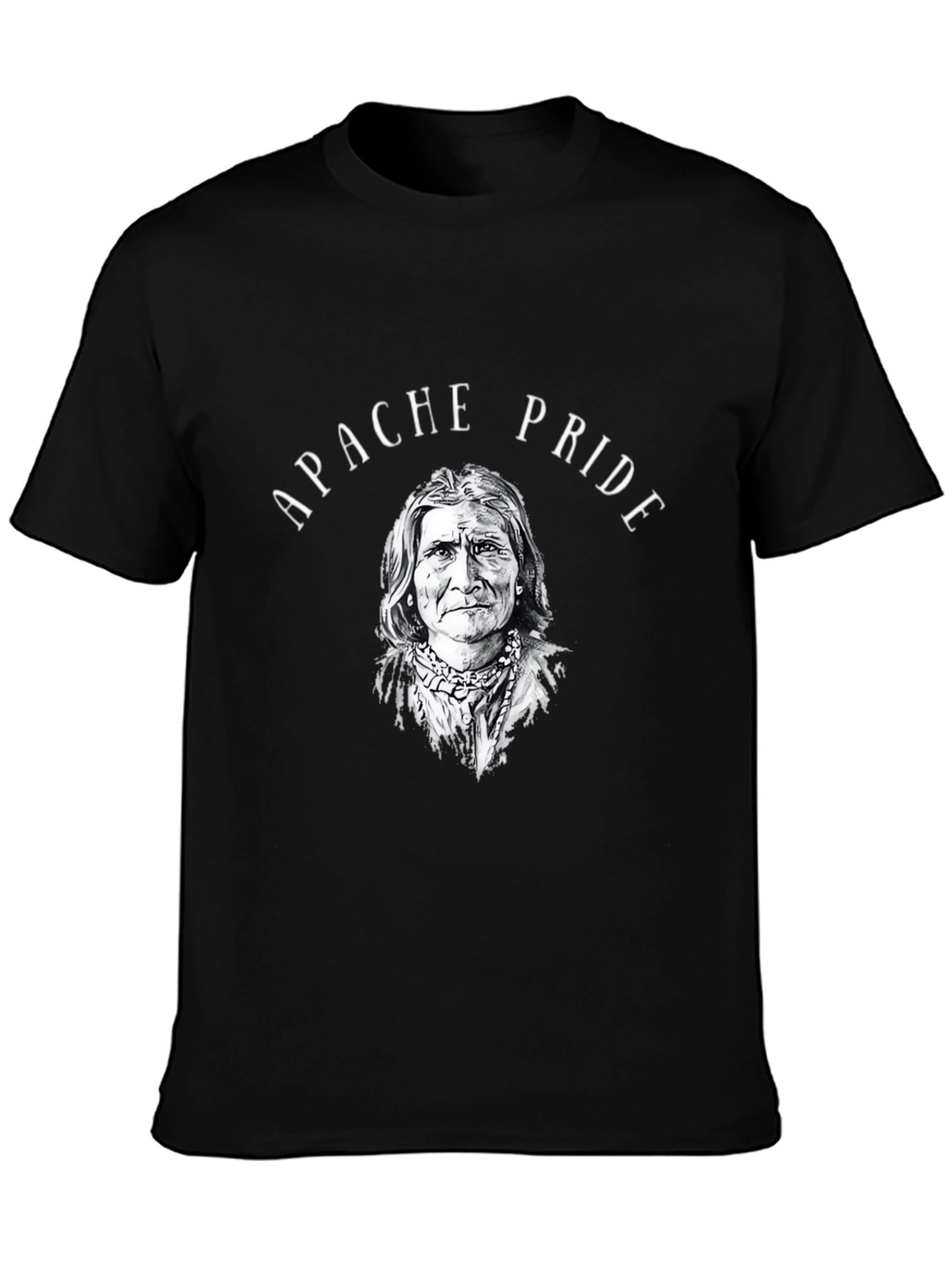 Show your respect with this striking black t-shirt featuring a detailed graphic print. The design centers on a dignified Native American portrait, framed by the words "Apache Pride" in an arch above. Crafted from what appears to be a comfortable and breathable fabric, this tee is perfect for everyday wear. Its classic fit and short sleeves make it a versatile addition to any wardrobe. Wear it to honor Native American heritage, cultural events, or simply as a statement piece with your favorite jeans or casual pants.