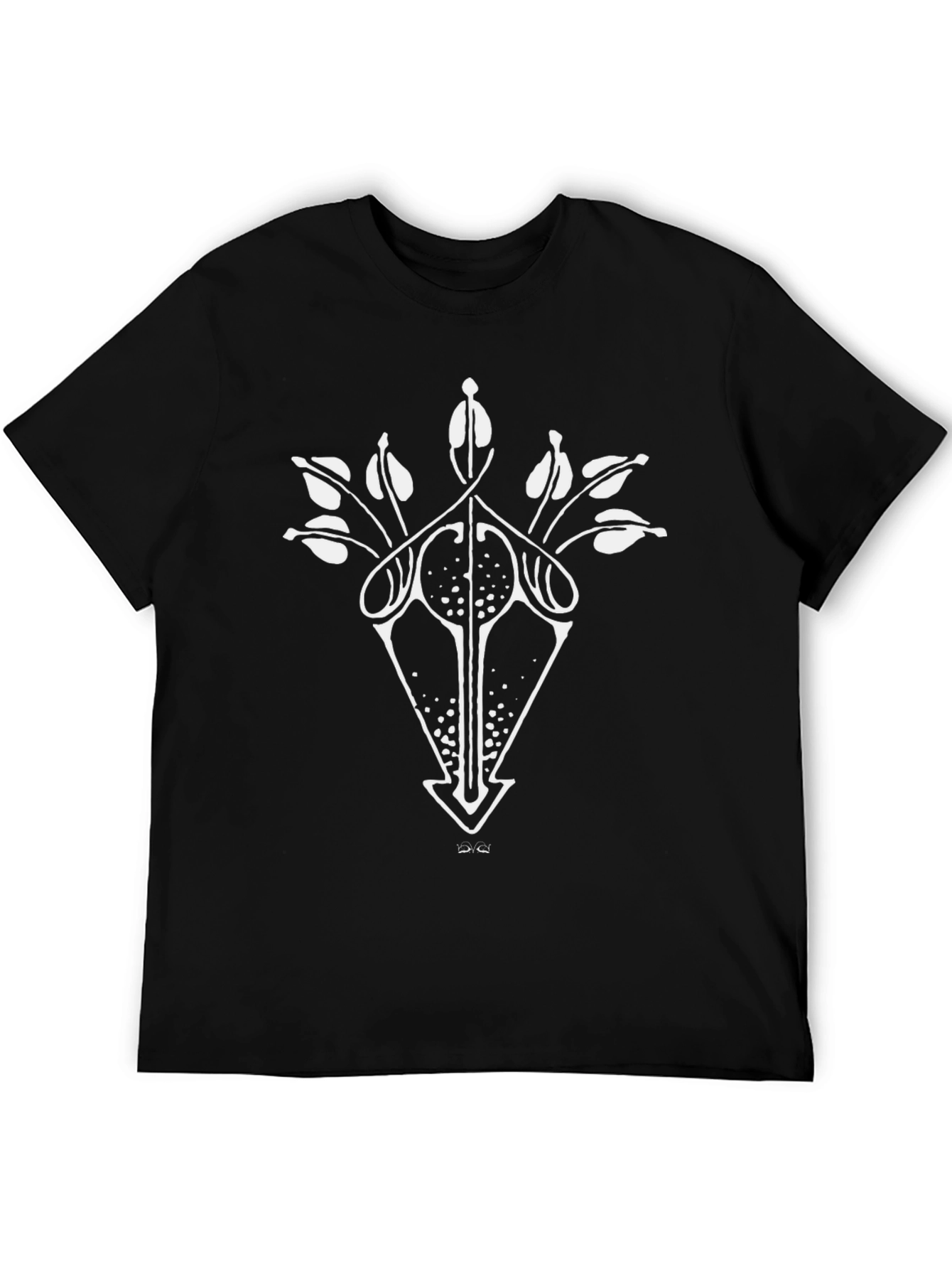 Showcase your unique style with this striking black t-shirt. The design features a captivating white art nouveau inspired graphic, depicting a stylized arrow with floral and leaf elements. The detailed artwork adds a touch of vintage sophistication to this modern garment. Made from comfortable, breathable fabric, this tee is perfect for everyday wear or for making a statement at casual events. Pair it with jeans or shorts for a effortlessly cool look. Express yourself with this eye-catching and artistic t-shirt.