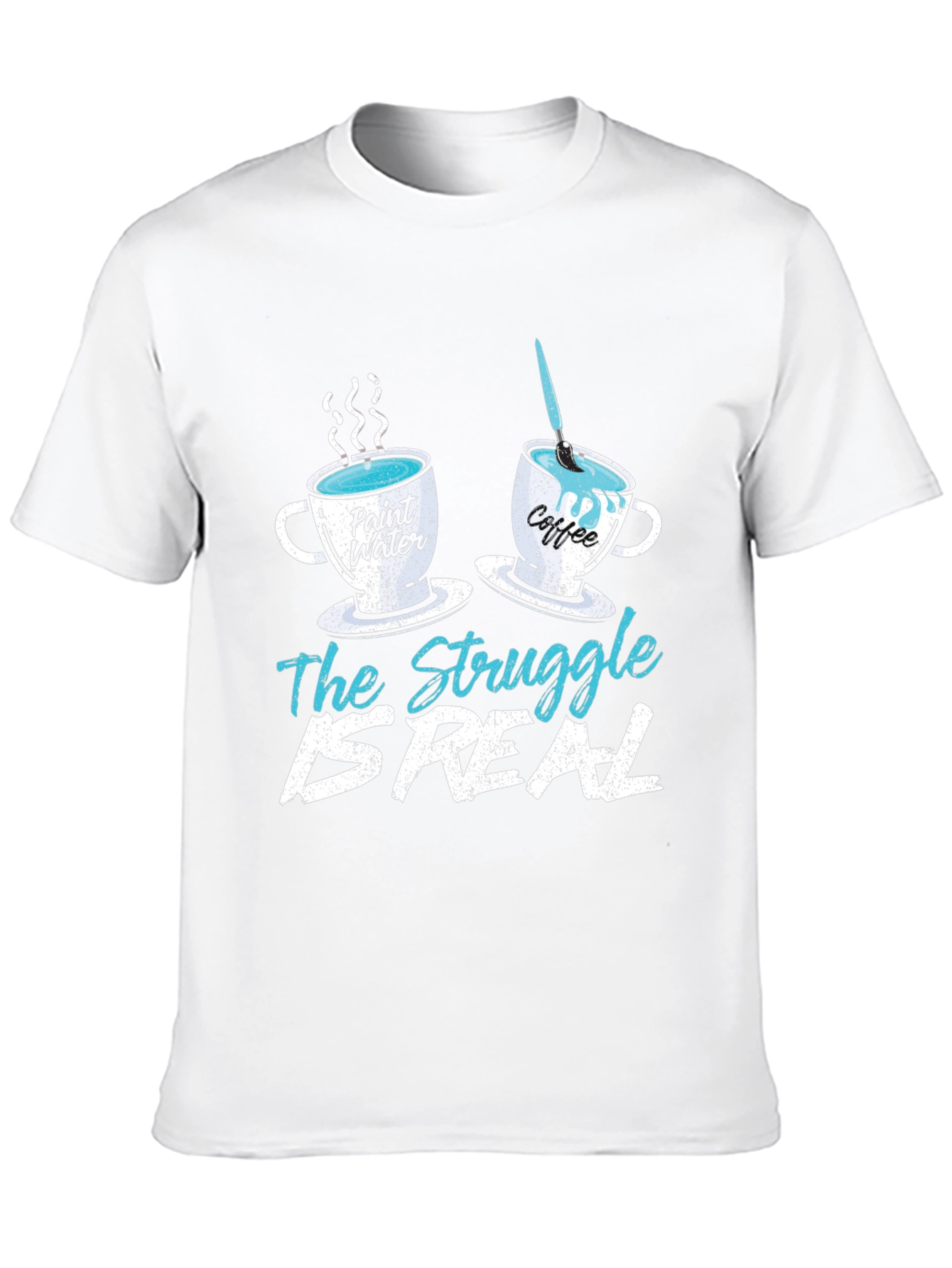 This black t-shirt features a whimsical design perfect for artists. The graphic includes two mugs: one labeled "Paint Water" with steam rising and the other labeled "Coffee" with a paintbrush in it. Below, the humorous phrase "The Struggle IS REAL" is printed in a distressed font. Made from a comfortable-looking fabric, this shirt is ideal for casual wear. Show off your artistic side with this unique and relatable tee!