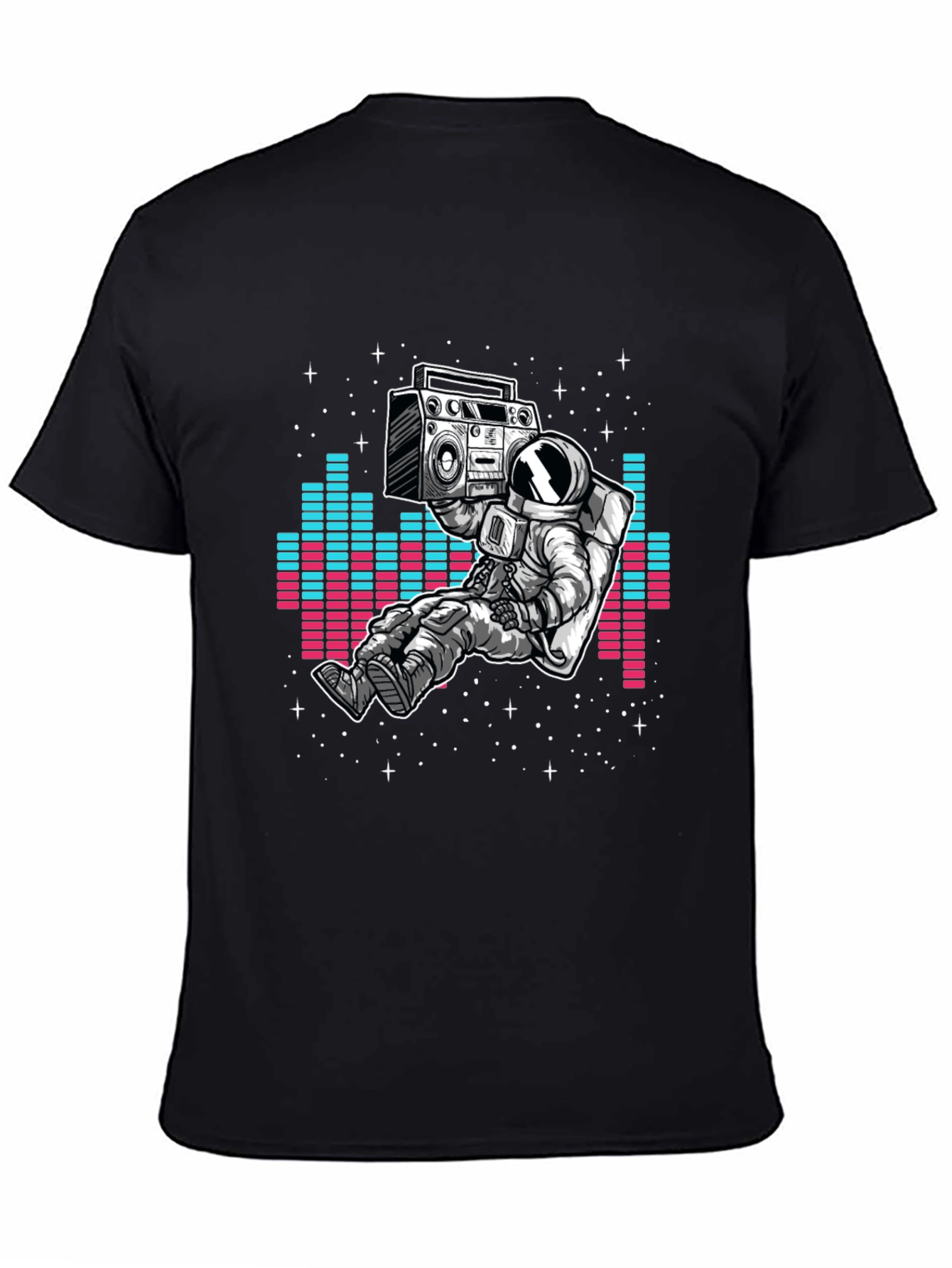 Show off your unique style with this eye-catching black t-shirt! The striking graphic features a detailed astronaut illustration, complete with a boombox, set against a cool equalizer and starry background. The design offers a fun, retro vibe with a modern twist. Made from what appears to be soft, breathable fabric, this t-shirt ensures both comfort and style. Perfect for casual wear, music lovers, space enthusiasts, or anyone looking to make a statement. Pair it with jeans or shorts for an effortlessly cool look. Get ready to turn heads with this conversation-starting tee!