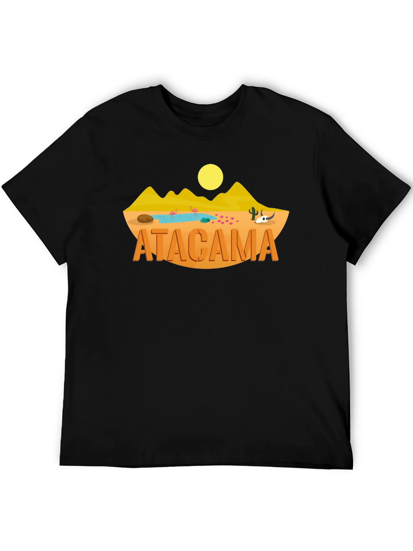 Show off your love for adventure with this unique Atacama Desert graphic t-shirt. This eye-catching black tee features a vibrant illustration of the Atacama Desert landscape, complete with mountains, a sun, and desert flora. The word "ATACAMA" is prominently displayed in a stylish, bold font. Made from what appears to be soft, breathable cotton, this tee offers all-day comfort and a classic fit. It's perfect for casual outings, travel adventures, or simply expressing your unique style. A must-have for anyone who appreciates distinctive designs and the beauty of the natural world. Get yours today and let your wanderlust shine!