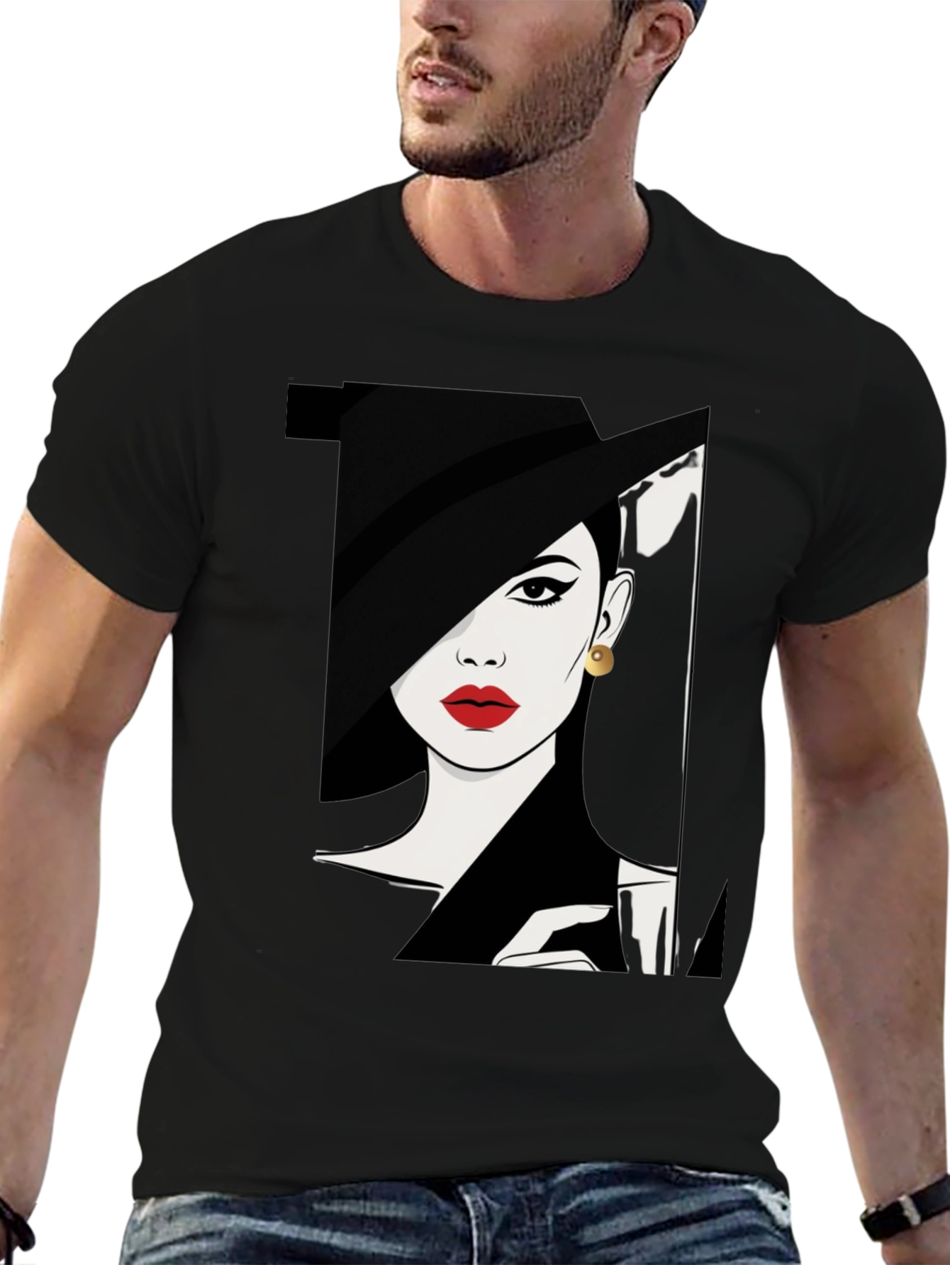 Embrace timeless elegance with this stylish black t-shirt featuring a striking graphic of a woman reminiscent of Audrey Hepburn. The design showcases a classic aesthetic with a black hat, bold red lips, and minimalist details. Made from a soft, comfortable fabric, this tee offers a relaxed fit suitable for everyday wear. Perfect for casual outings, movie nights, or adding a touch of sophistication to your wardrobe. Pair it with jeans or a skirt for a chic, effortless look. Show off your appreciation for iconic fashion with this eye-catching statement piece!