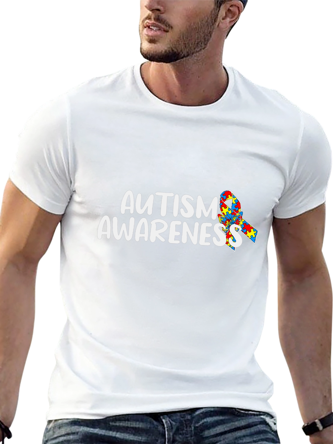 Show your support with this stylish Autism Awareness t-shirt. This black tee features a bold "Autism Awareness" print in white, accompanied by a colorful puzzle ribbon design. The striking graphic symbolizes the complexity and diversity of autism. Made from what appears to be a comfortable, breathable cotton blend, this classic-fit shirt is perfect for everyday wear, walks, charity events, or simply raising awareness. Wear it with pride and spark conversations about autism acceptance and inclusion. A meaningful way to make a statement and support a great cause.