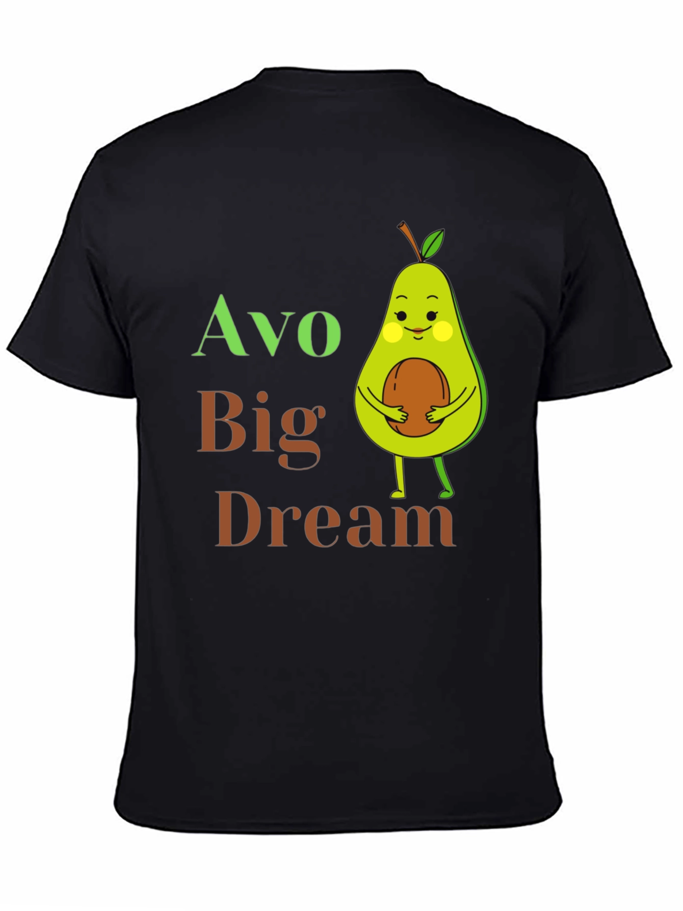 Show off your love for avocados with this charming black T-shirt! Featuring a delightful cartoon avocado graphic, the tee playfully states "Avo Big Dream" in colorful lettering. The design showcases a cute avocado character holding its pit, adding a touch of whimsy. Made from what appears to be soft, comfortable cotton, this shirt is perfect for everyday wear. Its versatile design makes it great for casual outings, lounging at home, or as a fun conversation starter. It’s an ideal gift for avocado enthusiasts and anyone with big dreams!