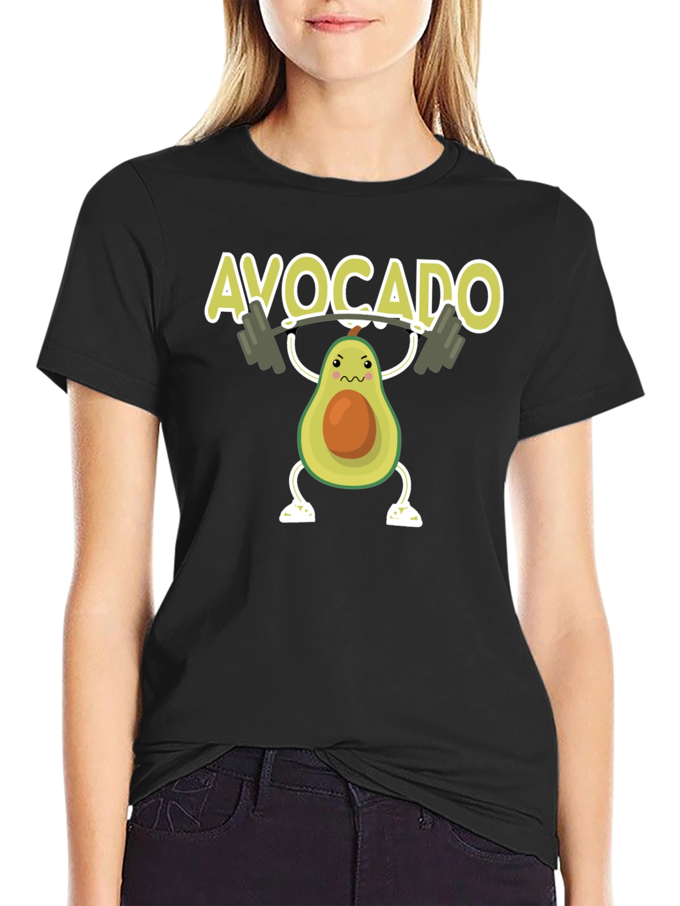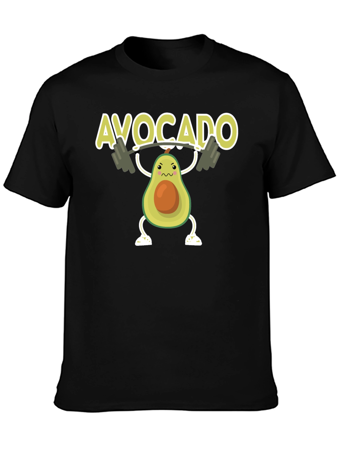 Show off your love for avocados and fitness with this unique graphic t-shirt. This black tee features a cartoon avocado character lifting weights, with the text "AVOCADO" displayed above. The design is printed with vibrant colors that pop against the black background. Made from a soft, comfortable fabric, this t-shirt is perfect for wearing to the gym, while running errands, or just lounging at home. A great gift idea for avocado lovers and fitness enthusiasts alike. Get yours today and add some fun to your workout wardrobe!