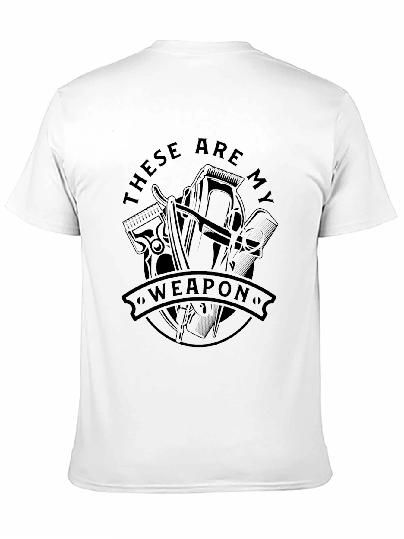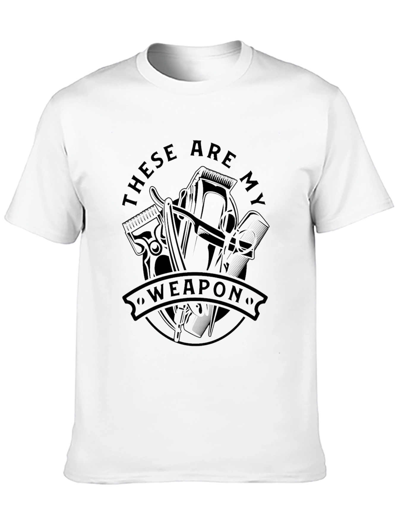 Show off your love for barbering with this stylish black graphic tee! Featuring a bold design of classic barber tools - clippers, straight razor, and comb - arranged in a striking emblem. Above the tools, the text reads "THESE ARE MY", with "WEAPON" displayed below. This shirt is perfect for barbers, hairstylists, or anyone who appreciates the art of grooming. The dark graphic on the black shirt creates a sleek, modern look that pairs well with jeans or casual wear. Made from comfortable materials, it's great for everyday wear at the shop or around town. A must-have for your barber wardrobe!