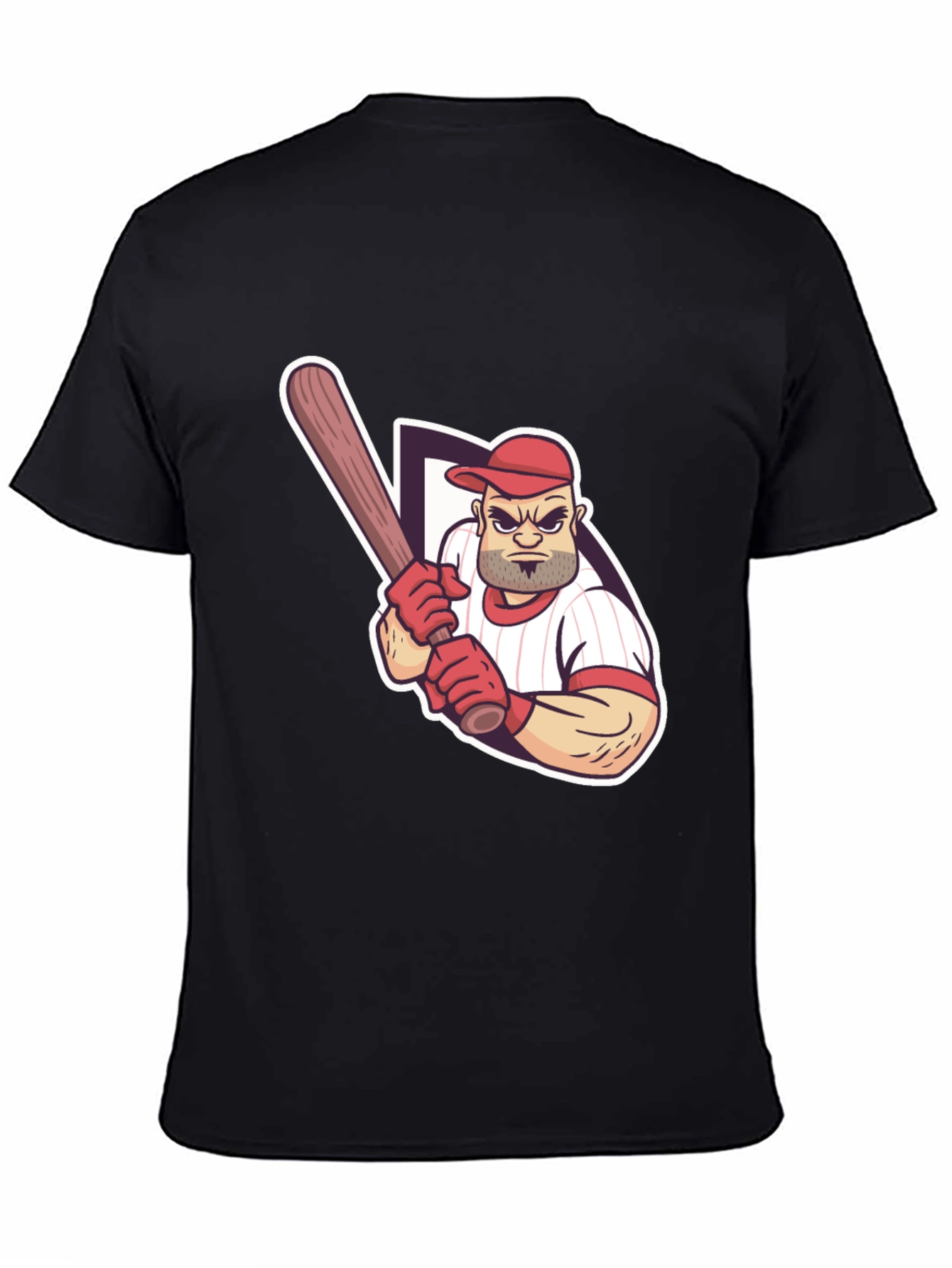 Showcase your love for baseball with this unique graphic tee. The shirt features a bold cartoon illustration of a determined baseball player, complete with a wooden bat, red cap, and striped jersey. Set against a white and purple background, this design is sure to catch the eye. Made from comfortable black cotton fabric, this t-shirt is perfect for casual wear, sports events, or as a standout piece in your everyday wardrobe. Enjoy the perfect blend of style, comfort, and baseball passion with this must-have tee.
