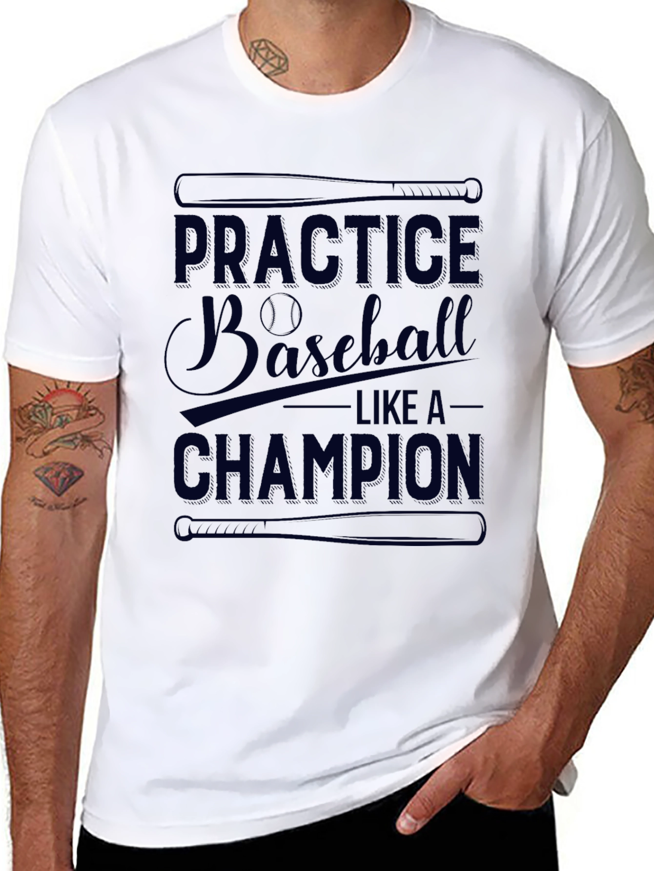 Show off your love for baseball with this stylish graphic t-shirt. The black tee features the phrase "Practice Baseball Like A Champion" in a blue font, accompanied by baseball bat graphics above and below the text and a baseball in place of one of the 'a's. Made from a soft and comfortable fabric, this shirt is perfect for casual wear or showing your team spirit. Great for athletes and fans alike. Whether you're heading to the ballpark, hitting the batting cages, or simply relaxing at home, this t-shirt is a home run!