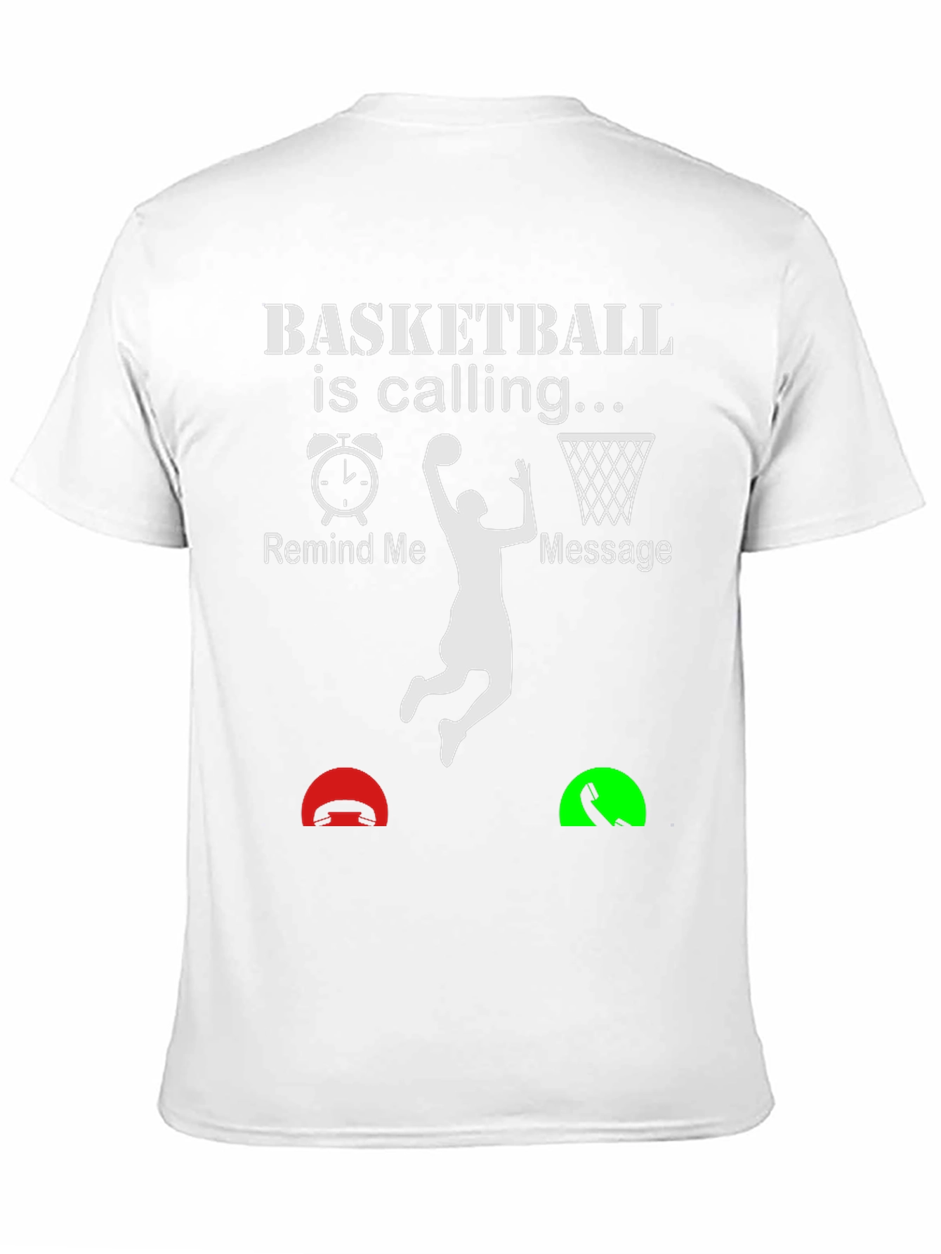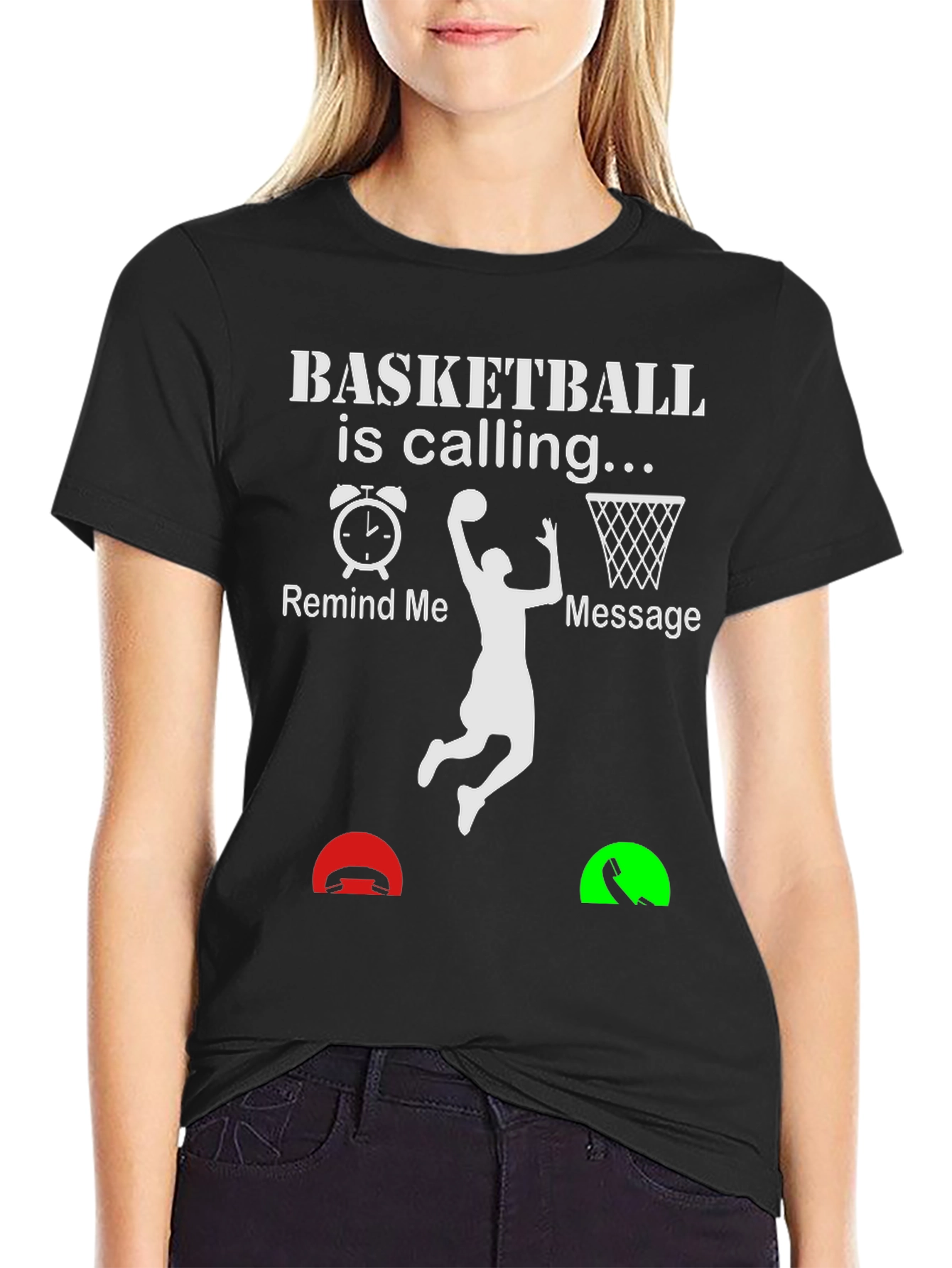 Show off your passion for basketball with this unique t-shirt! The black tee features a playful design with the phrase "Basketball is calling...", accompanied by graphics of an alarm clock, basketball player, and basketball hoop. Below are call icons, signifying "Remind Me" and "Message." Made from comfortable materials, this tee is perfect for casual wear, workouts, or showing off your love for the game on and off the court. It's also a great gift for basketball players and fans alike.