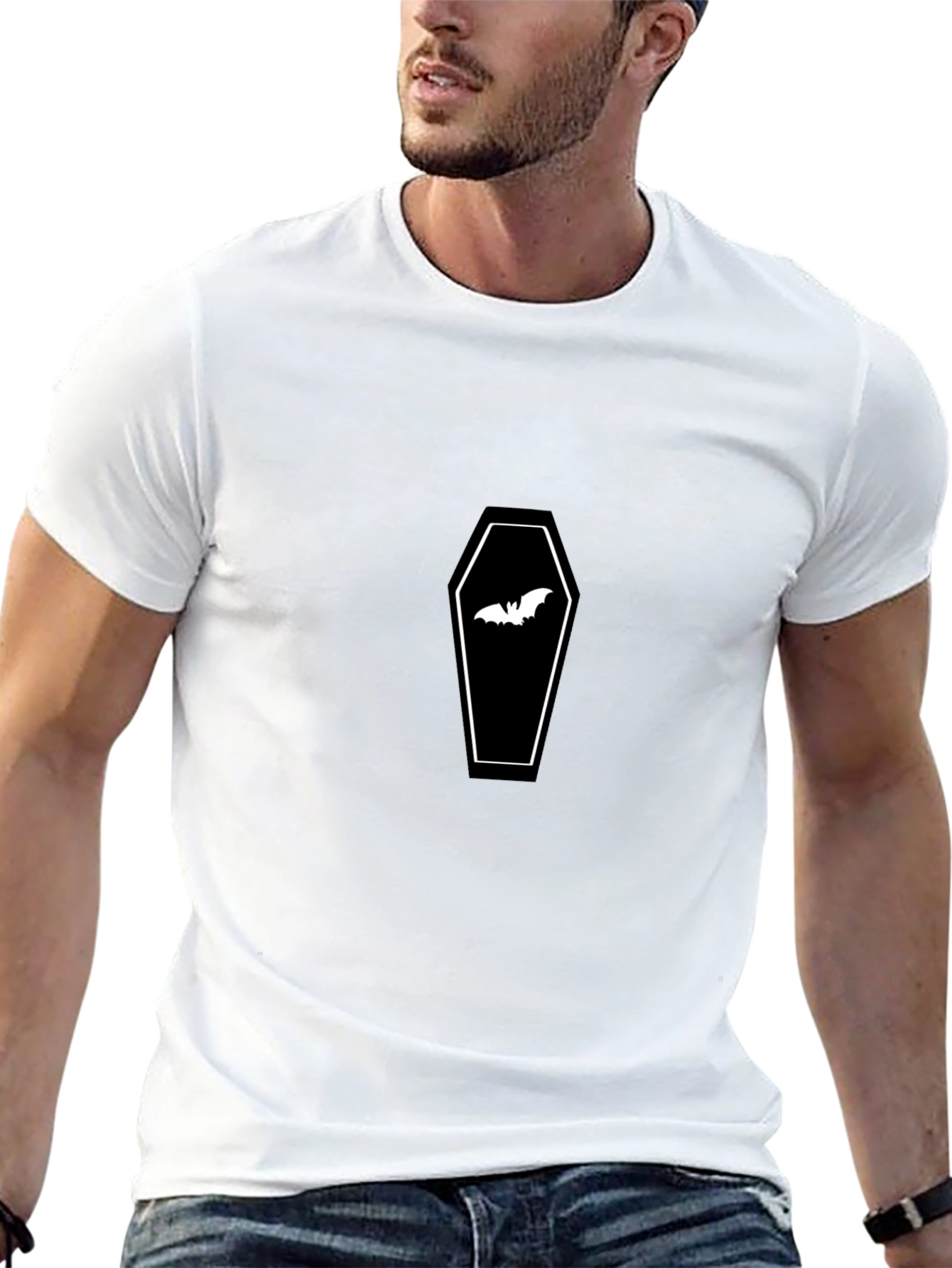 Get spooky in style with this unique black graphic tee. The shirt features a bold design of a bat inside a coffin outline. Perfect for Halloween, casual wear, or expressing your edgy side, this tee is a must-have for those who love alternative fashion. Made with comfortable materials, it's ideal for everyday wear while making a statement. Add some personality to your wardrobe and showcase your love for spooky vibes with this eye-catching T-shirt.