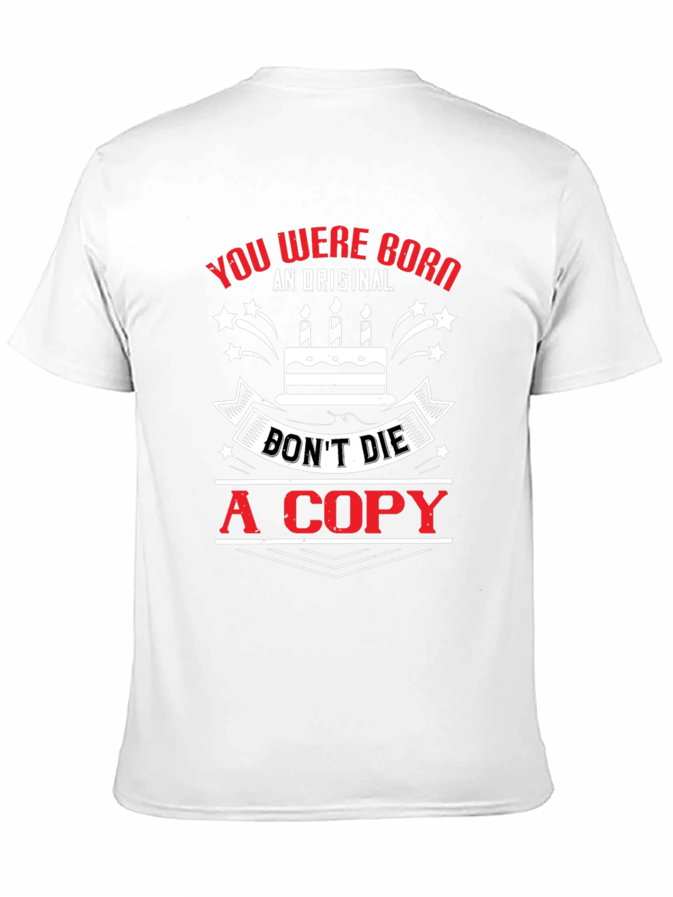 This black t-shirt makes a bold statement with its unique graphic design. The shirt features the phrase 'YOU WERE BORN AN ORIGINAL DON'T DIE A COPY' surrounding a birthday cake illustration. The design uses a mix of red and white colors for a striking contrast against the black backdrop. Made from what appears to be a soft, breathable cotton blend, this tee promises all-day comfort and style. Ideal for casual outings, social gatherings, or as a conversation starter. Wear your originality and stand out from the crowd with this expressive t-shirt.
